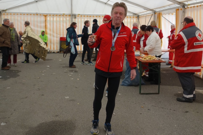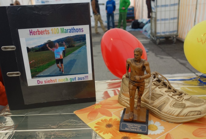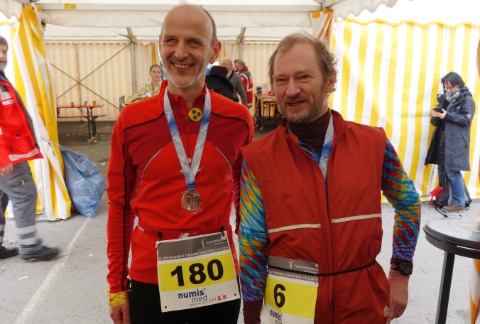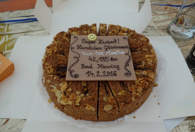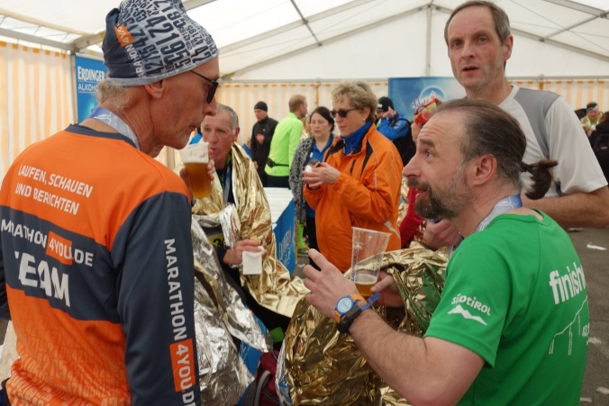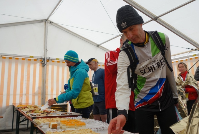 Wir warten noch kurz auf den großen M4Y-Champion Herbert Orlinger, der heute seinen 100. Marathon beendet. Anscheinend hat er halb Österreich als „Verstärkung“ mobilisiert, darunter auch zwei unermüdlich applaudierende Damen an der Strecke. Das Jubiläum muss gefeiert werden und somit gibt es auch für uns ein Glas Sekt und ein Stück Torte – Linzer natürlich. Fast übersehen habe ich im Trubel M4Y-Ländersammler Anton Reiter, der heute auch dabei ist.