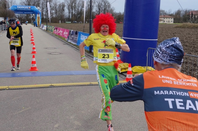 Auf ein Neues! Theoretisch hätte ich noch eine kleine Chance, unter vier Stunden zu bleiben. Hänge mich also an eine Dame, die für den Oberpfälzer Wald wirbt: Der befindet sich in Bayern (und nicht in Rheinland-Pfalz), wie auf ihrem Hemd zu lesen ist. Das weiß ich als Bayer natürlich. Aber vielleicht können Teilnehmer aus anderen (Bundes-)Ländern ja ein wenig Geographie-Nachhilfe gebrauchen... Die „Oberpfälzerin“ zieht mich eine Zeitlang mit. Wir tangieren Eitlöd, Pimsöd, Zieglöd, Schöchlöd, Dürnöd... auf der langen Geraden.