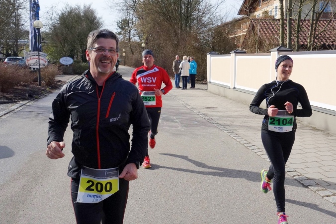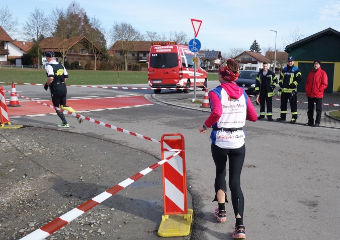 Auch die „Öd“nis hat einmal ein Ende und es geht wieder nach Safferstetten. Erfrischend die kurze Begegnungsstelle: Einige Läuferinnen sind hinter mir, darunter auch Judith. Am zentralen Platz kann man nun einen Kreuzungsverkehr beobachten: Manche Sportskanonen sind schon 10 Kilometer weiter und düsen munter dahin.