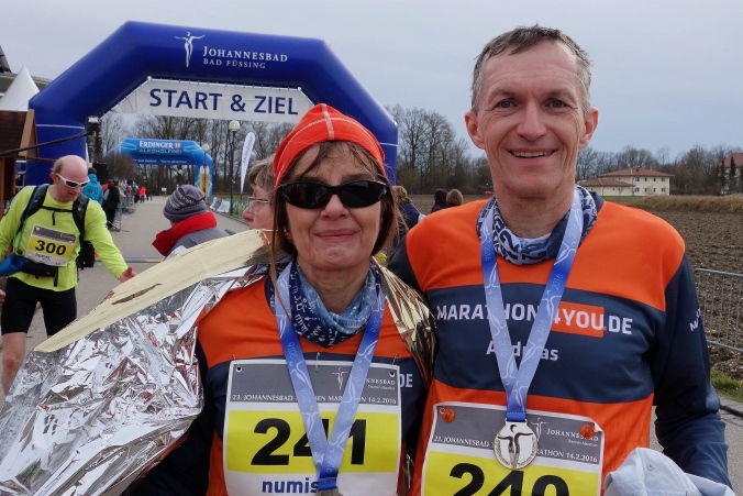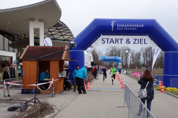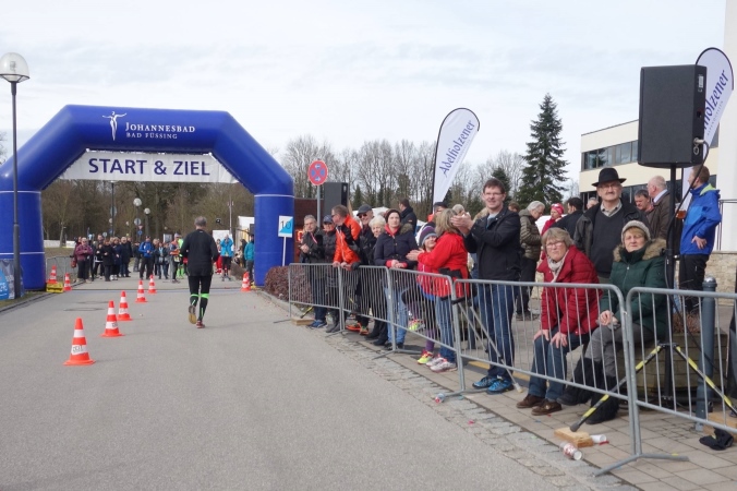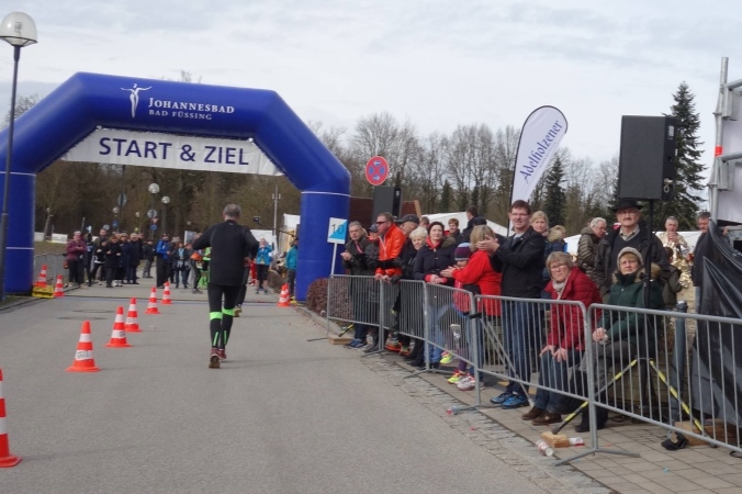 Auf den letzten zwei Kilometern vor dem Johannesbad überholen uns sehr flotte Läufer, die noch unter 3 Stunden ins Ziel kommen werden. Die Dame in diesem Feld ist Angela Kühnlein, die mit 2:58:52 ihren fünften und schnellsten Sieg in Bad Füssing erläuft. Meine Frage an einen vorbei eilenden Herrn, ob wir wohl die Plätze tauschen können, hat nur ein mitleidiges Kopfschütteln zur Folge.
