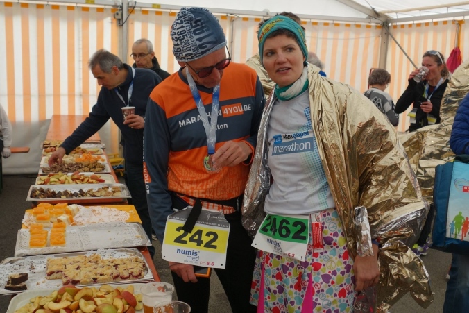 Bei km 19 treffen wir wieder auf bekanntes Terrain. Die zwei Kilometer bis zum Ziel sind viermal zu absolvieren. Den Zusammenfluss regeln ein junger Mann auf seinem Spielzeugtrecker, sein Papi und mehrere freundliche Helferinnen. Vor den Thermen begrüßt Moderator Artur Schmidt die Halbmarathonis, die ihr Soll nun erfüllt haben. Bei jedem Vorbeilaufen hören wir neue Anekdoten. Der Mann immer für fünf Stunden informative Unterhaltung gut. An der Verpflegungsstelle gibt es auch Energiegel, zusätzlich zu Obst und Müsliriegeln, Wasser, Tee und Iso-Getränk. Letzteres übrigens angewärmt. Das volle Programm genießt man alle 5 Kilometer. Judith hole ich genau hier ein.