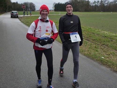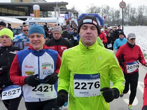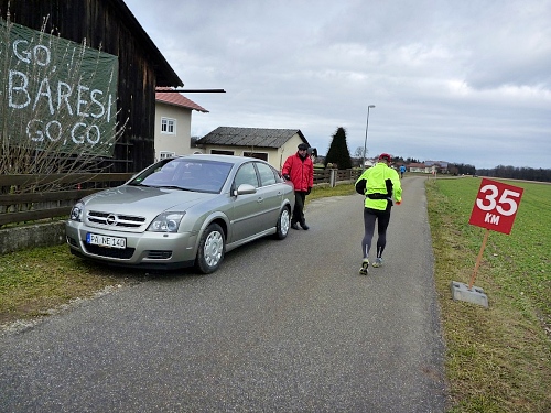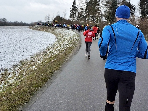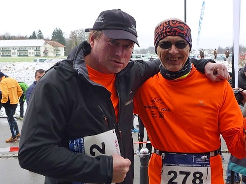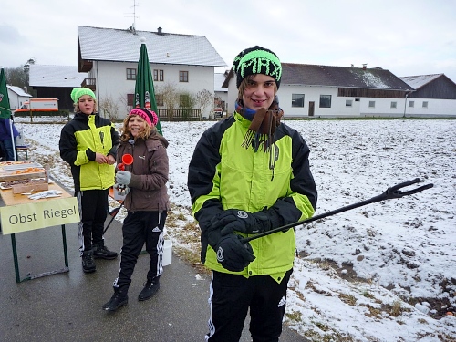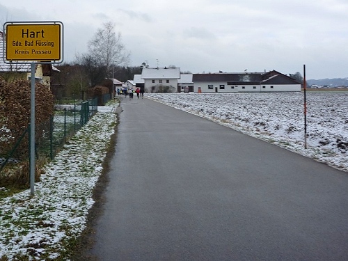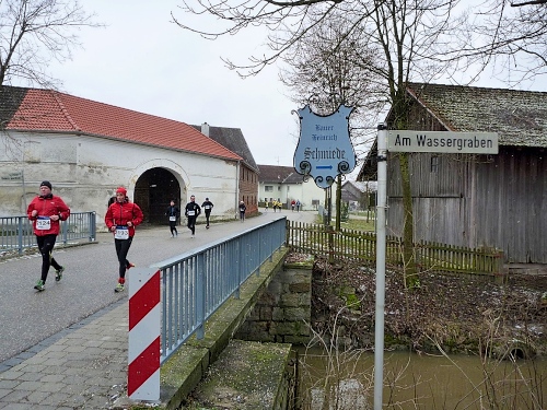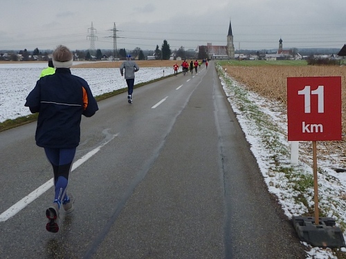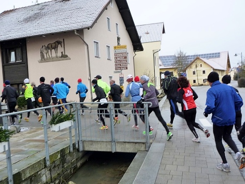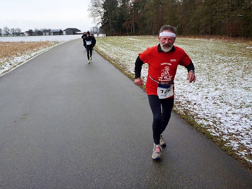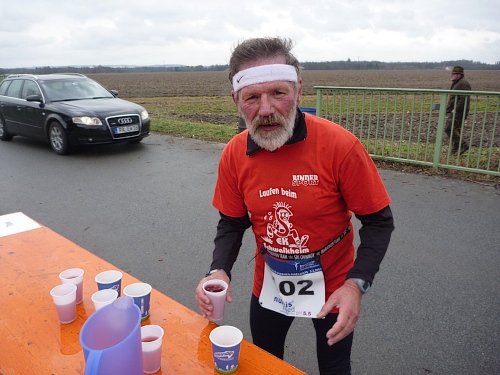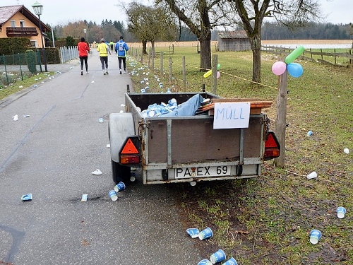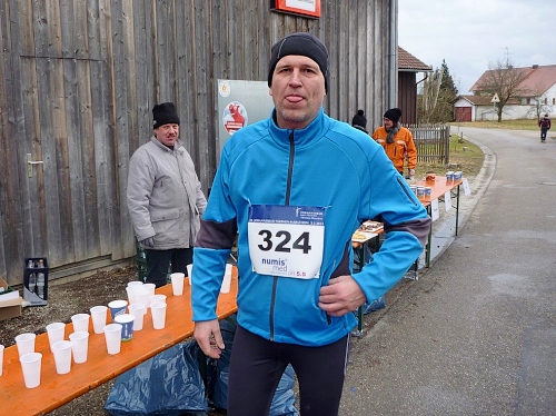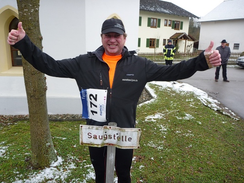 Dem an der Verpflegungsstation brülle ich entgegen, dass es hier unheimlich stinkt. “Wo stinkt es?” - “Bei euch!“ Der scheint nix mehr zu riechen, sagt dann aber doch, dies müsse der Schweinstall nebenan sein. „Das haben wir extra so gemacht, damit der Lauf härter wird!” Stimmt, wir befinden uns im Ortsteil Hart. Ich versuche ihm klar zu machen, dass dieser Geruch einen bitteren Geschmack hinterlässt. Da habe ich auch schon einen Becher mit natürlichem Bittergeschmack in der Hand. Das nenne ich Service.