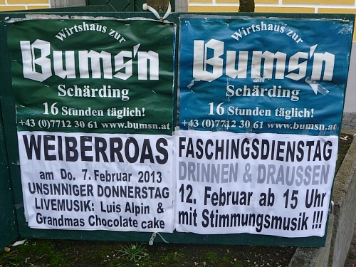 Schließlich sind Maren, Günter und ich beim Bums´n. Das Plakat: “Weiberoasen beim Bums´n” hört sich vielversprechend an. Wir betreten das urige Wirtshaus, wo unerwartet, direkt hinter der Eingangstür, die Treppen hinunter zu einem schiefen Bretterboden führen. Beinahe wäre ich hin gebumst. Der Name des Gasthauses stammt aus einer Zeit, als die Bierfässer noch mit der Kutsche angeliefert wurden. Man ließ die Fässer einfach hinunterrollen und nur der Tresen konnte die schweren Dinger stoppen, als sie dort “anbumsten”.