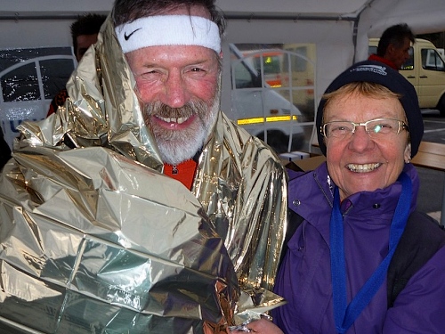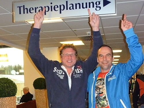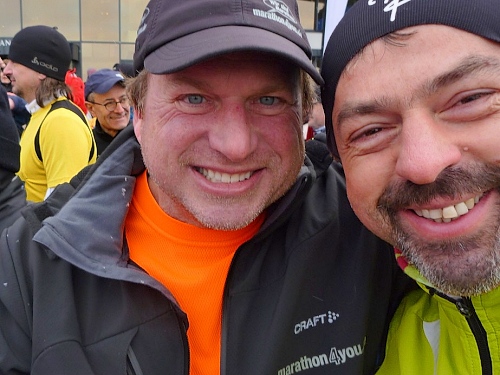 Auf der Ziellinie, ich lasse mich gerade von Petra ziehen, steht so ein Patient am Streckenrand. Es ist Frank. Er brüllt mir entgegen: “Endlich bekomme ich ein Foto mit dem Joe!” Ich sag, dass ich jetzt keine Zeit hab und laufe stur weiter. Da brüllt der Kerl: “Du kannst dich gar nicht wehren, ich habe hier auf dich gewartet. Wir laufen zusammen über die Ziellinie, dann gibt es automatisch Fotos mit uns beiden!”