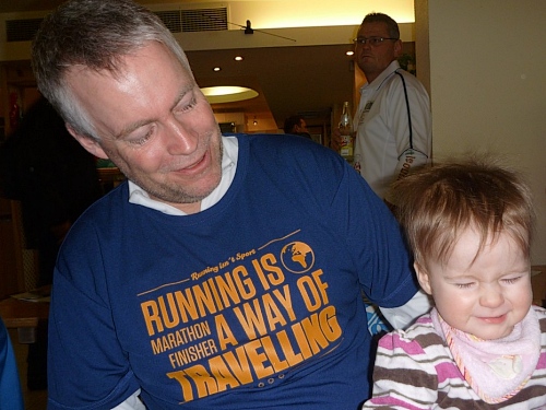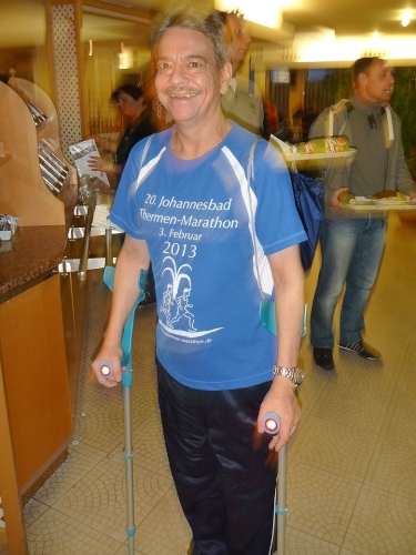 Was für ein Bericht, wenn ich wesentliche Programmpunkt ausfallen lassen muss? Nun hat der Typ mir gegenüber etwa 20 Starterbeutel abgeholt. Quälend lange 10 Minuten brauche ich, um ihn zu überzeugen, dass seine mutmaßliche Klasse 7 b der Mädchenschule keine Verwendung für die Getränkegutscheine hat. Dann wird’s lustig. Es ist das groteske Aufeinandertreffen von Sportlern und Patienten im Restaurant. Mir ist nicht klar, wer hier wen begafft. Wir überdrehte Läufer die Patienten mit ihren Gehhilfen, oder die Kriegsversehrten in Bademänteln, die unsere geilen Finisher-Shirts bestaunen? Der Hit ist aber die Symbiose aus beidem: Der Typ mit Krücken, der das Finishershirt von morgen trägt. Alle sind sie sehr therapiebedürftig!