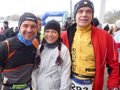 Und da steht dann auch unser Klaus. Da muss ich herzlich lachen. So kommt es zu dem Finisherbild mit Petra, Frank und mir.