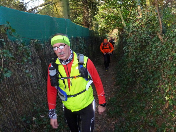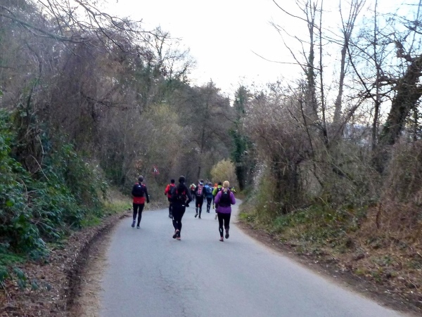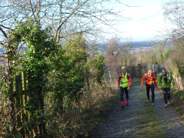 Schnell verlassen wir Dossenheim. Es geht bergauf und bald liegt Heidelberg im morgendlichen Dunst unter uns. Das Wetter verspricht schön zu werden. Mit 5 °C ist es auch nicht so kalt. Wir verlassen den Asphalt und machen mit dem ersten Single Trail Bekanntschaft. Das Feld ist mittlerweile enteilt und ich bin froh, dass Norbert mit mir läuft. Da meine Uhr nur eine Akkulaufzeit von ca. 7 Stunden hat, laufen wir zunächst mit Norberts GPS Gerät. Meines werde ich erst ab der ersten VP zuschalten. Ich hoffe, das ist für den Veranstalter o.k.; schließlich dienen die Aufzeichnungen ja später als Nachweis für die gelaufene Strecke.