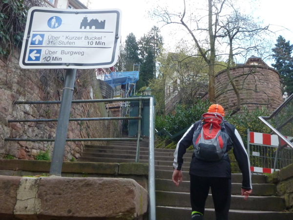 Am Karlstor überqueren wir die Straße, um auf einem kleinen Serpentinenweg das Schloss zu erreichen. Der Track weist nach rechts und so laufen wir unterhalb des Schlosses wieder bergab, bis wir linker Hand eine lange Treppe mit dem frechen Namen „kurzer Buckel“ erreichen. Da müssen wir hinauf.
