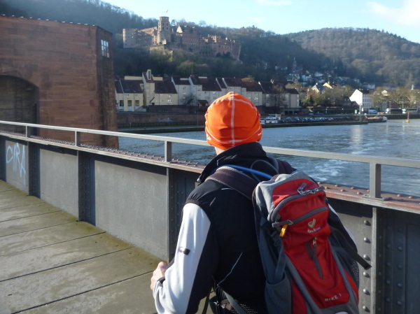 Wir überqueren den Neckar auf einem eisernen Fußgängersteg, der über dem Wehr der Staustufe Heidelberg verläuft. Von dort genießen wir einen erstklassigen Blick auf die Alte Brücke und dem darüber thronenden Schloss. Die 200 m lange barocke Alte Brücke ist nur werktags von 6 bis 10 Uhr für den Autoverkehr geöffnet; heute, am Samstag, dient sie als Fußgängerbrücke. Sie ist eines der letzten großen Beispiele klassischer Brückenbaukunst, ehe im 19. Jahrhundert der neue Baustoff Gusseisen vorherrschend und der Brückenbau zu einer reinen Ingenieursaufgabe wurde. Ihre ästhetische Wirkung beruht, neben ihrem Wert als Baudenkmal, vor allem auf ihrer landschaftlichen Lage im Neckartal und dem Panorama, das sie mit der Altstadt und dem Schloss im Hintergrund bietet. Im Jahr 2002 wurde die Brücke in die damalige Liste der am meisten gefährdeten Denkmäler der Welt, des WorldMonuments Fund, aufgenommen.
