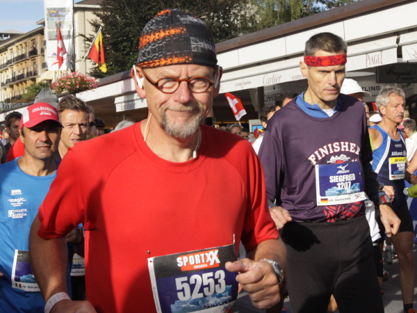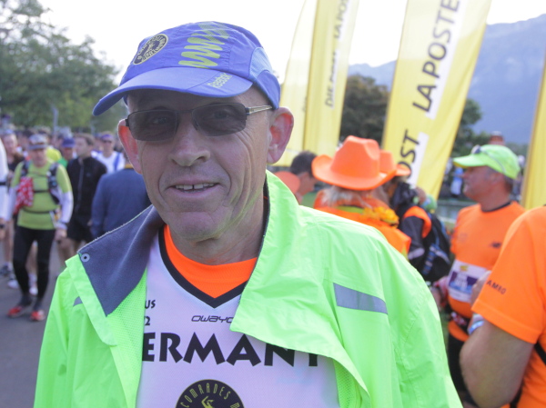 Stellvertretend für alle „Normalos“ sei einer genannt, den ich an gleicher Stelle mit gleicher Mütze und gleichem Shirt im letzten Jahr auch schon abgelichtet habe: Klaus Neumann, einer der ganz wenigen, der heute zum 23. Mal auf die Strecke geht. 23mal Jungfrau Marathon geht so: bei allen 21 Veranstaltungen dabei (und im Ziel) und zu den Jubiläen (10. und 20.) jeweils ein Doppelstart.