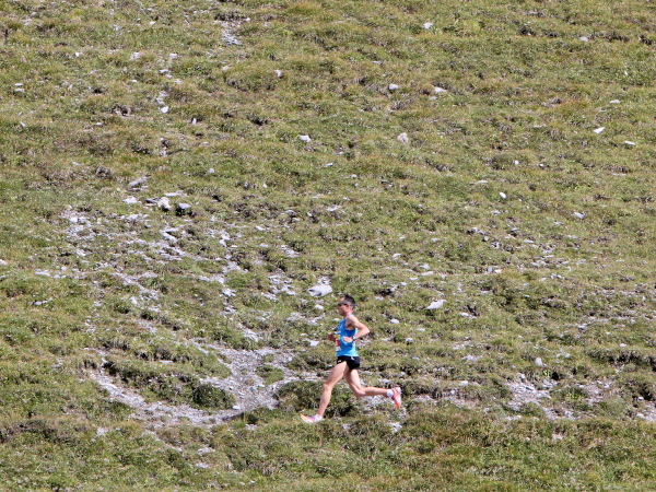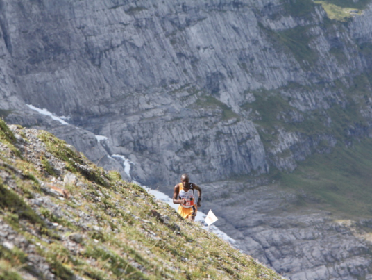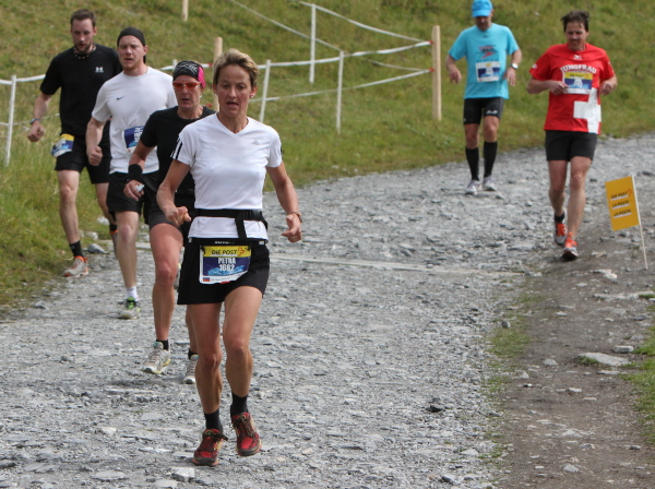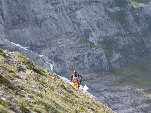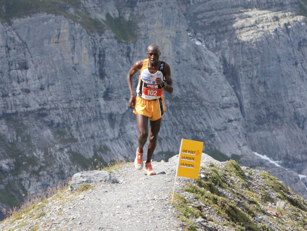 In einer halben Stunde etwa muss der Erste hier vorbei. Vom Mann am Datasport-Computer weiß ich, dass es nicht Viktor Röthlin sein wird. Er lag bei der letzten Zeitnahme 20 Sekunden zurück. Endlich, es geht los, Jeffrey Ndungu taucht auf, gut zwei Minuten später Mamo Petro. Er macht keinen guten Eindruck, schaut sich um. Fast in Sichtweite ist Viktor Röthlin, 30 Sekunden dahinter. Er wirkt frischer. Noch 300 m steil bergauf. Kann er den Mann aus Eritrea noch einholen? In langen Schritten läuft dieser bereits auf der flachen Passage Richtung Locherflue. Nein, der schwächelte nur am Berg und hätte dort seinen Vorsprung keinen Kilometer mehr halten können. Aber jetzt lässt er sich den zweiten Platz nicht mehr nehmen. Viktor Röthlin wird mächtig angefeuert, es bleibt ihm aber „nur“ die Bronze-Medaille.