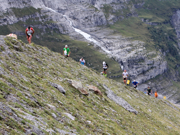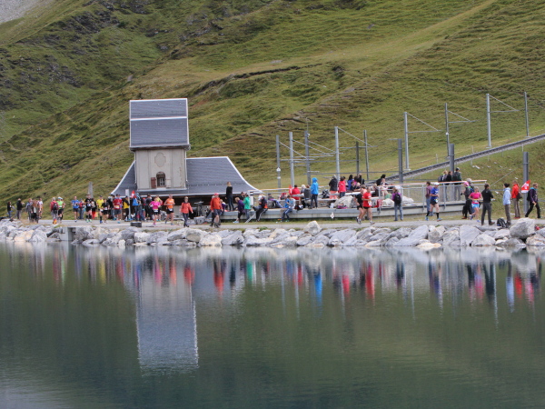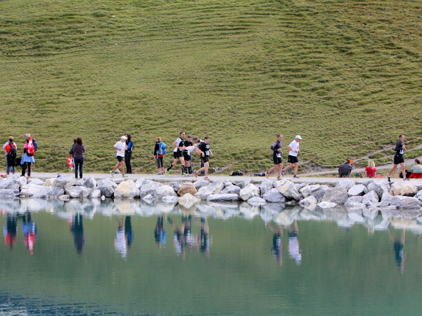 Die Schlachtenbummler strömen hinauf in Richtung Zielbogen. Manche sichern sich gleich dort einen Platz in der ersten Reihe, andere gehen weiter zum Fallboden-Speichersee und ein paar machen sich wie ich auf den Weg zum höchsten Punkt (Locherflue). Von dort gehe ich weiter zur Moräne. Wenn ich schon nicht mitlaufe, dann will ich wenigstens von der spektakulärsten Passage ausgiebig Fotos machen. Einige Fotografen haben sich dort längst breit gemacht. Es geht ausnahmsweise mal friedlich zu. Manchmal gibt es richtig Stress, wenn ein Kollege sich in letzter Minute vor einem postiert. Ich denke dann immer, wie schön es ist, wenn ich als Läufer nur den Markierungen nachrennen muss und beim Fotografieren immer in der vordersten Reihe bin.