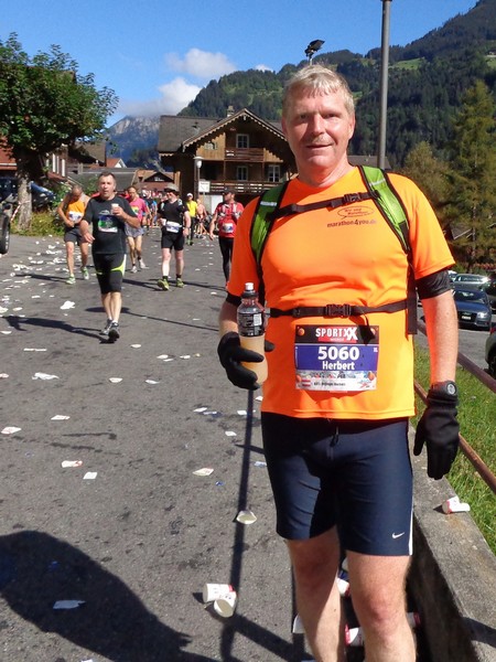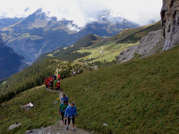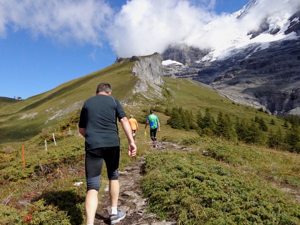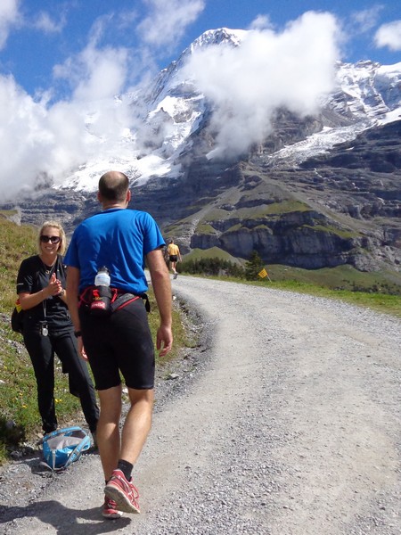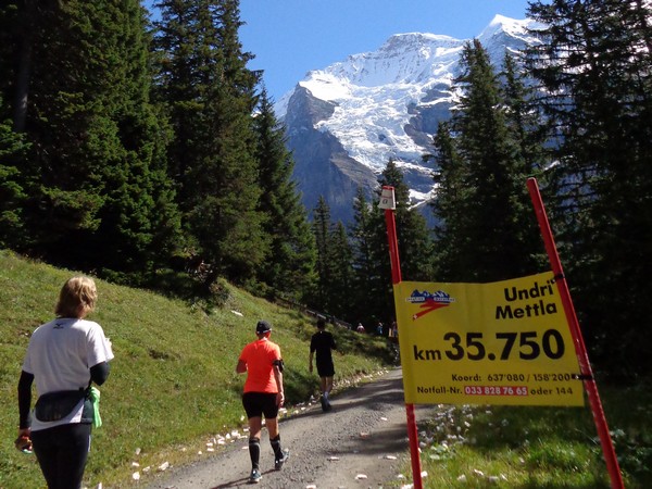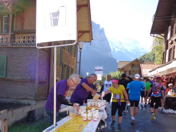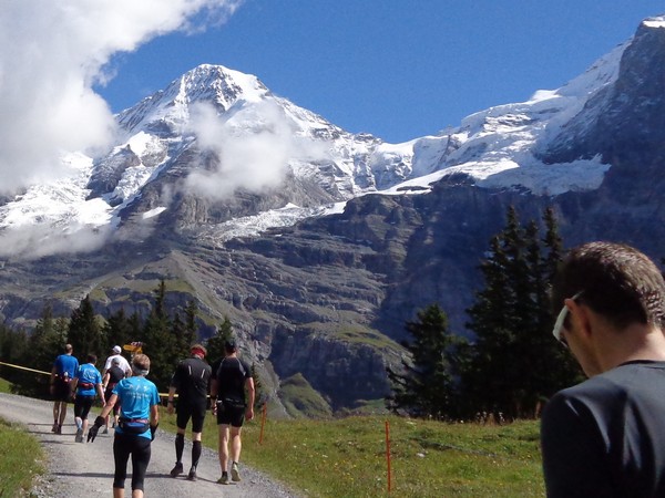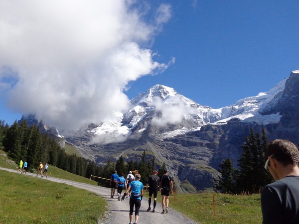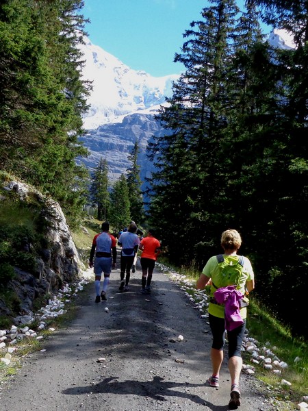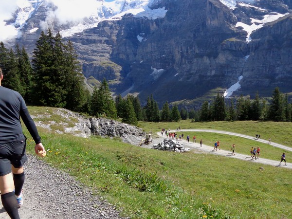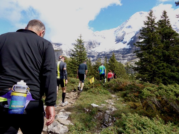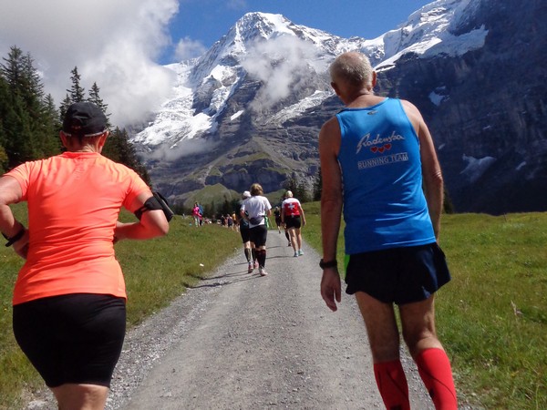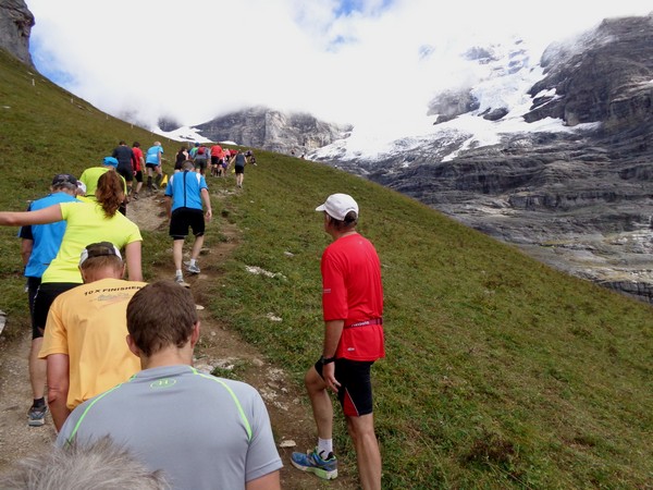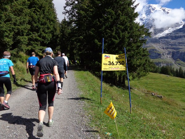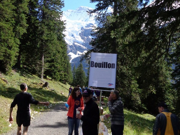 Nach 2km Anstieg gibt es Wasser, nun kann man am Hang entlang laufen. Viele Veranstalter haben als Faustregel, alle +/- 5km gibt es eine Labestelle. Hier trägt man dem Streckenprofil Rechnung, schon nach weiteren anderthalb km die nächste Labe. Der Blick auf das Jungfraumassiv wird immer grandioser. Da treffe ich einen neuen Bekannten vom Vorabend. Er sagte, er starte immer weit hinten und überhole dann nicht viele. Da meinte ich, dann könnten wir uns ja treffen unterwegs. Genauso ist es.