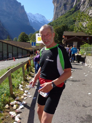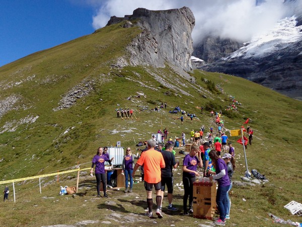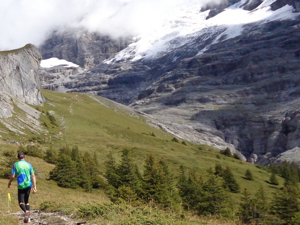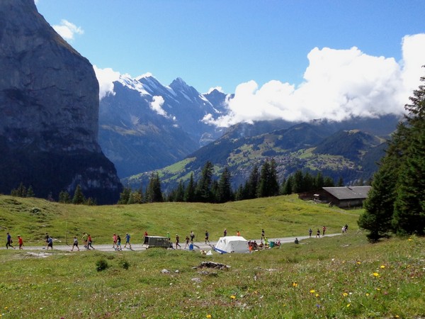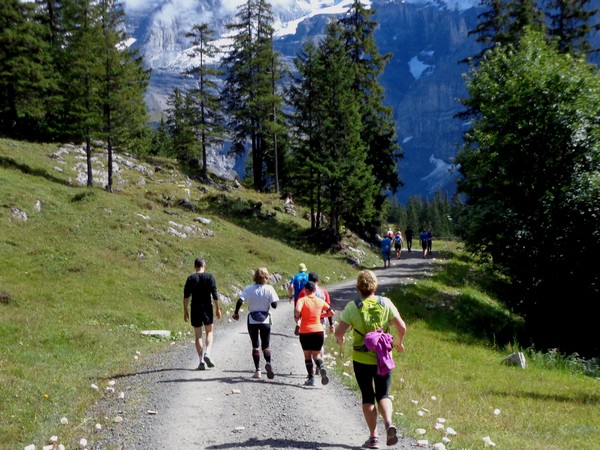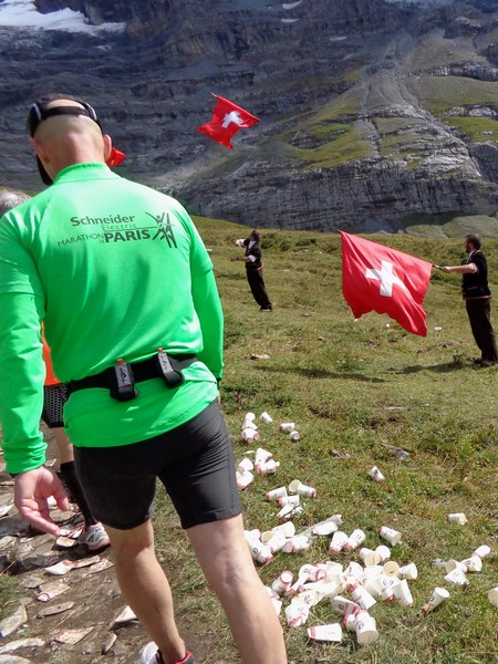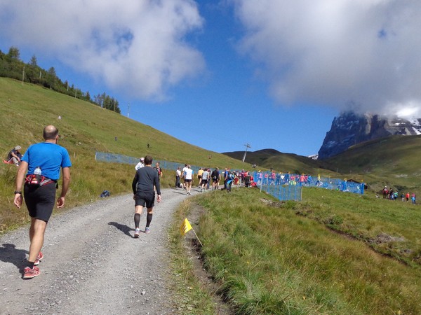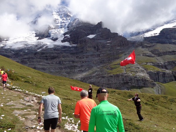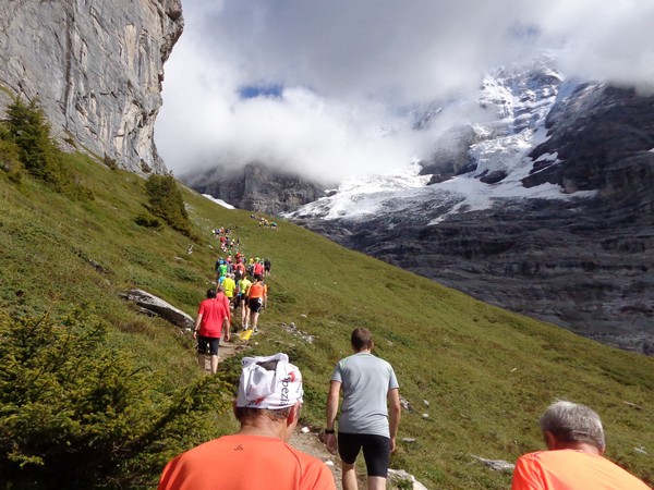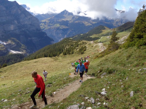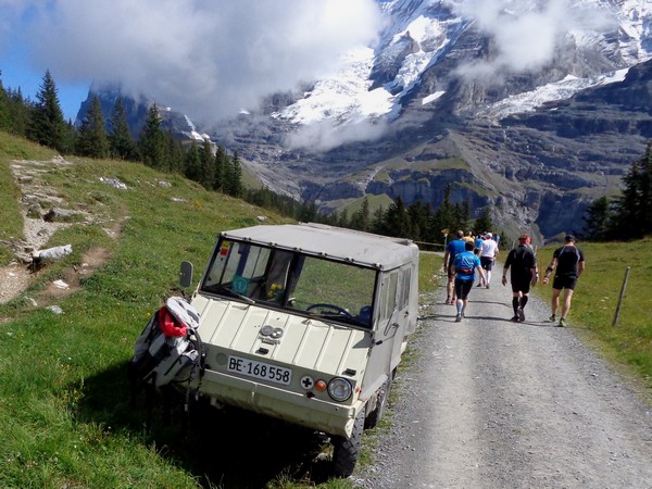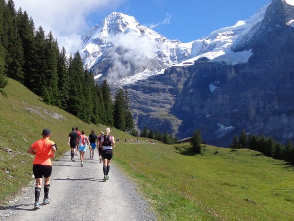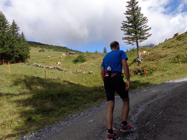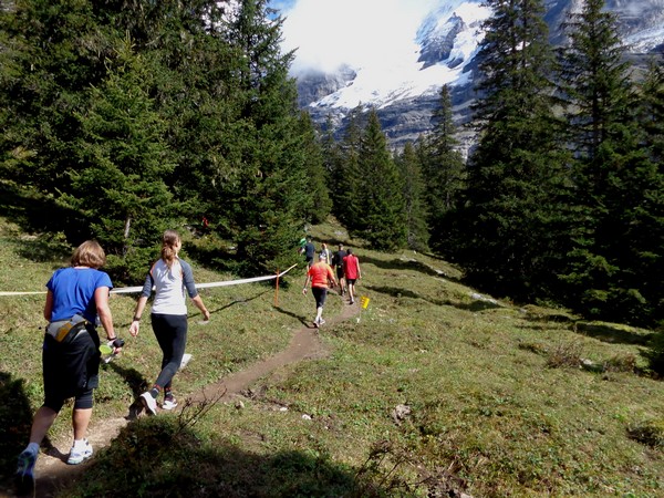 Nach 2km Anstieg gibt es Wasser, nun kann man am Hang entlang laufen. Viele Veranstalter haben als Faustregel, alle +/- 5km gibt es eine Labestelle. Hier trägt man dem Streckenprofil Rechnung, schon nach weiteren anderthalb km die nächste Labe. Der Blick auf das Jungfraumassiv wird immer grandioser. Da treffe ich einen neuen Bekannten vom Vorabend. Er sagte, er starte immer weit hinten und überhole dann nicht viele. Da meinte ich, dann könnten wir uns ja treffen unterwegs. Genauso ist es.