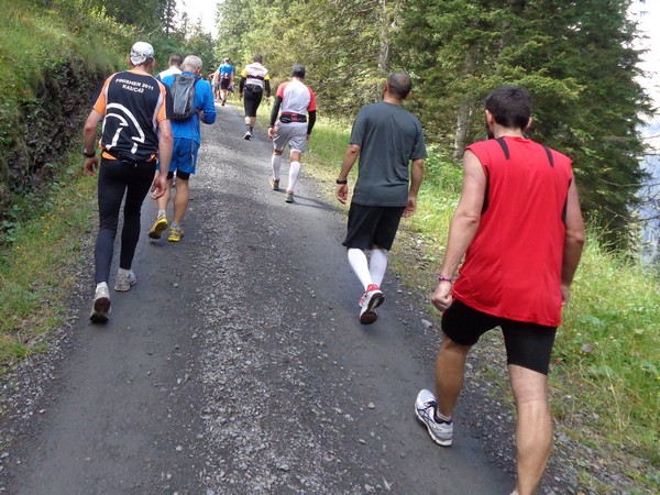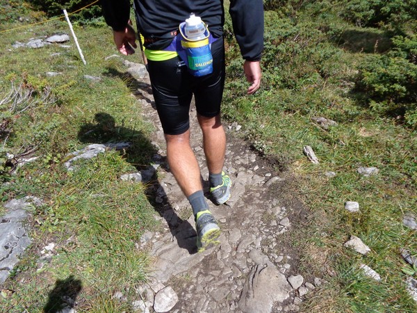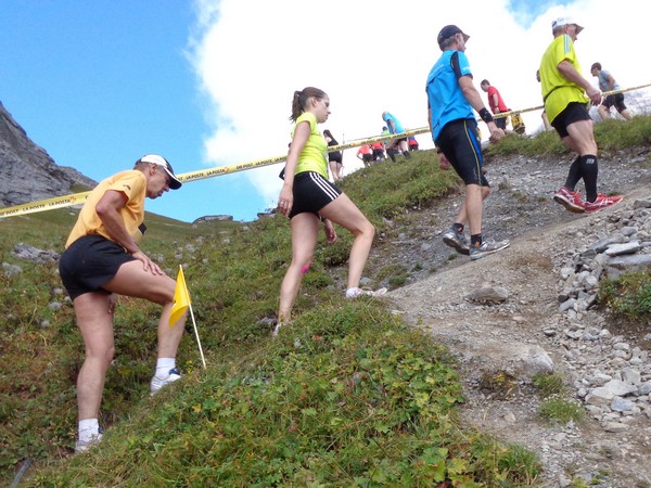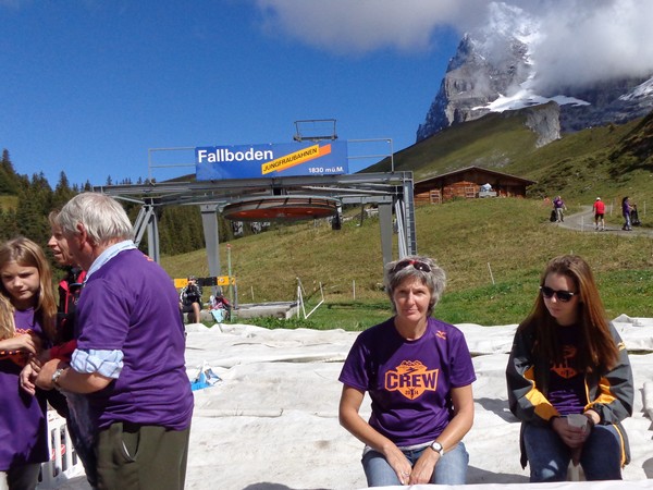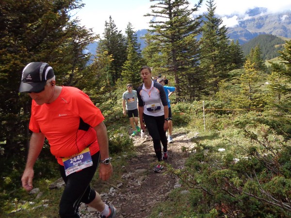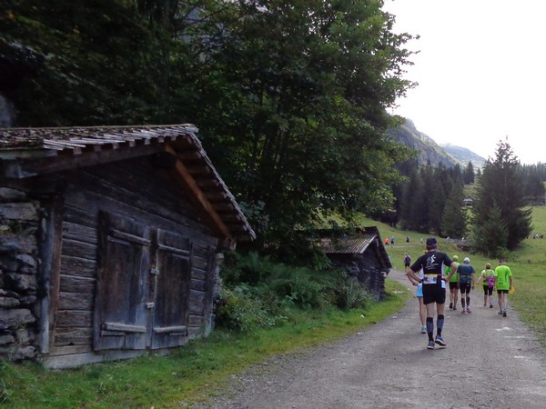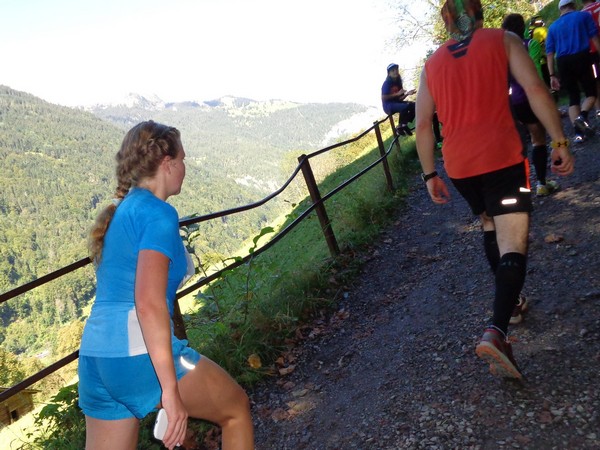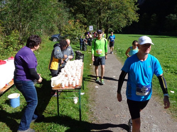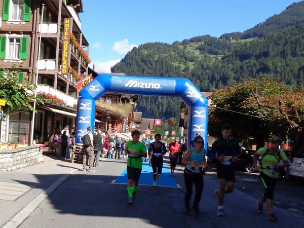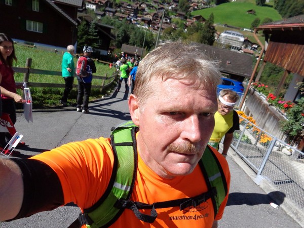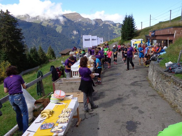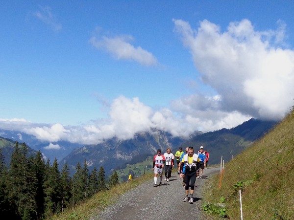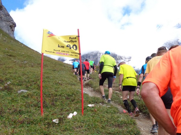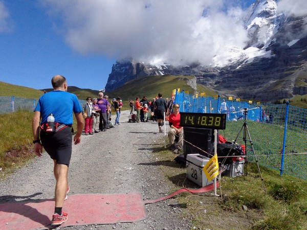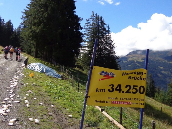 Nach 2km Anstieg gibt es Wasser, nun kann man am Hang entlang laufen. Viele Veranstalter haben als Faustregel, alle +/- 5km gibt es eine Labestelle. Hier trägt man dem Streckenprofil Rechnung, schon nach weiteren anderthalb km die nächste Labe. Der Blick auf das Jungfraumassiv wird immer grandioser. Da treffe ich einen neuen Bekannten vom Vorabend. Er sagte, er starte immer weit hinten und überhole dann nicht viele. Da meinte ich, dann könnten wir uns ja treffen unterwegs. Genauso ist es.