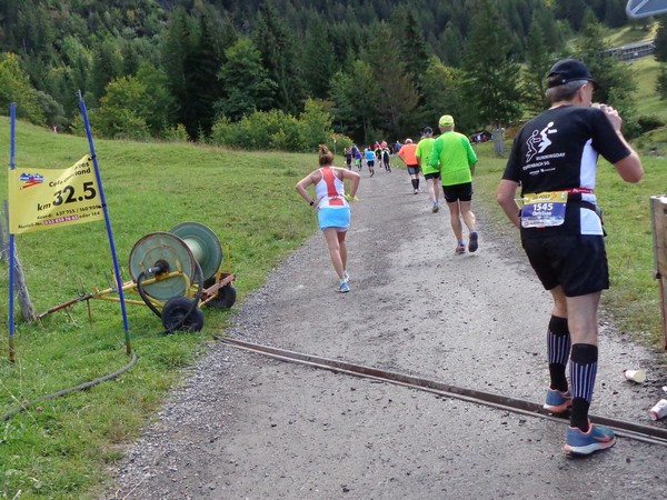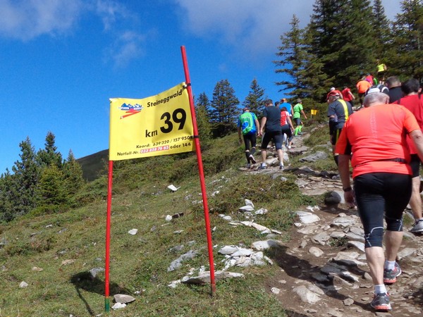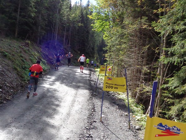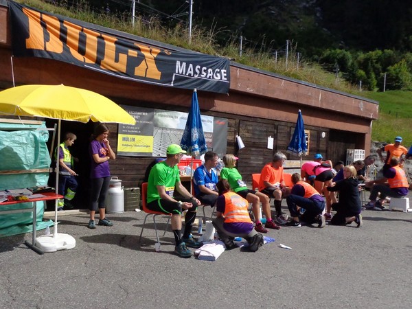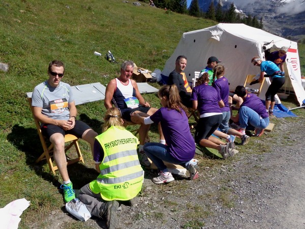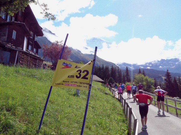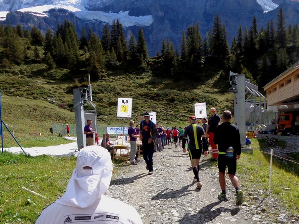 Die Physiostation in Wengen (km29,1) hat reichlich Besuch. Die Masseure haben alle Hände voll zu tun. Weiter in Wengen (km30,3) wird die nächste Zwischenzeit genommen, 3h49 habe ich bisher gebraucht. Viele Zuseher feuern uns an, zum Teil stehen die wohl schon seit zwei Stunden hier.