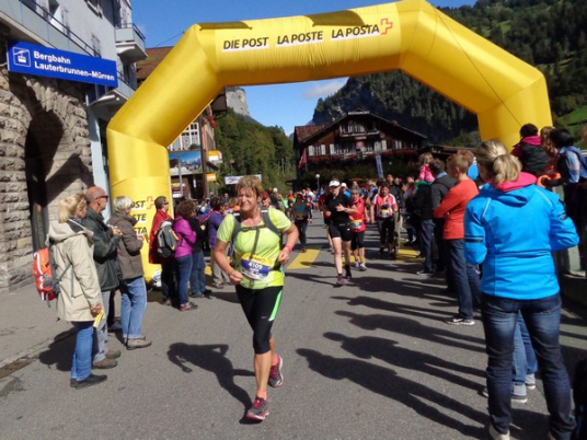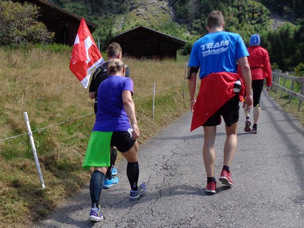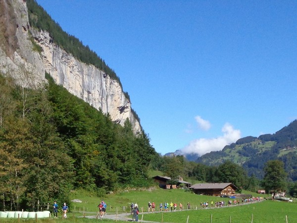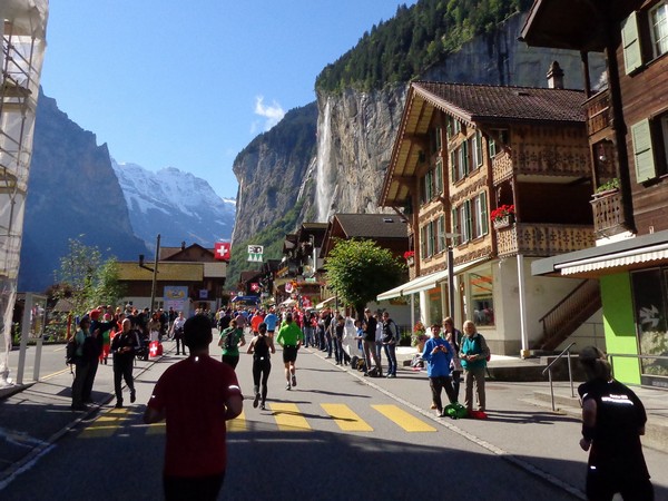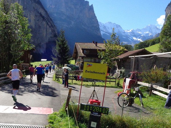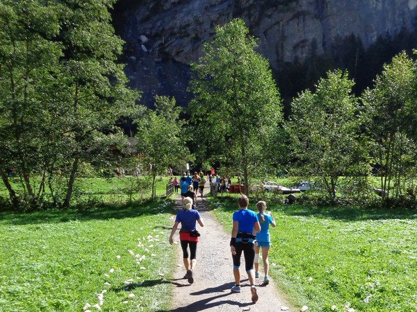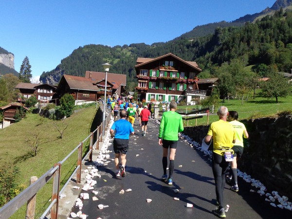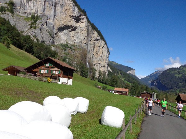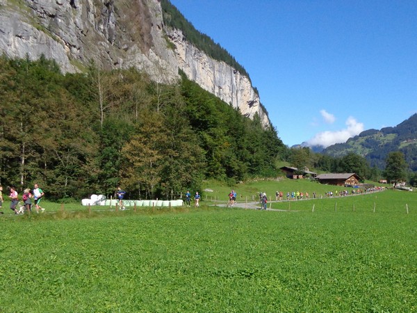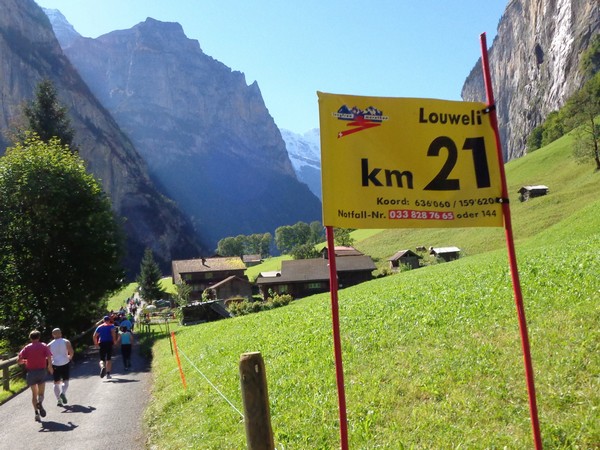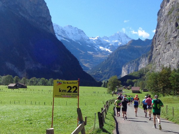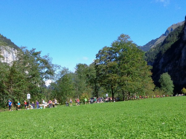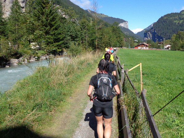 Wir laufen weiter im Tal der Weissen Lütschine Richtung Lauterbrunnen. Bei km17 verengt sich der Weg, die ganze Partie kommt immer zum Stillstand. Stop ‚n’ Go für einige Minuten. Am jenseitigen Ufer fährt die Eisenbahn, die Fahrgäste jubeln uns zu. Die Höhenmeter werden immer mehr. Als für ein paar 100m die Sonne auf die Strecke scheint, genieße ich die wärmenden Strahlen. Immer wieder hat man freien Blick auf die Gletscher am Ende des Tales, das sieht einfach gut aus.