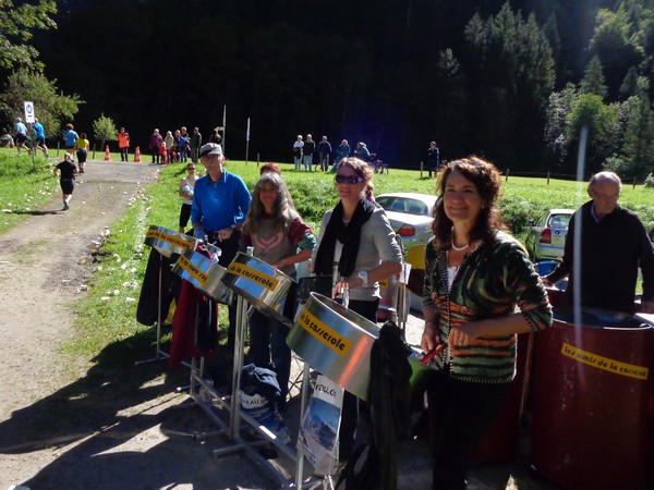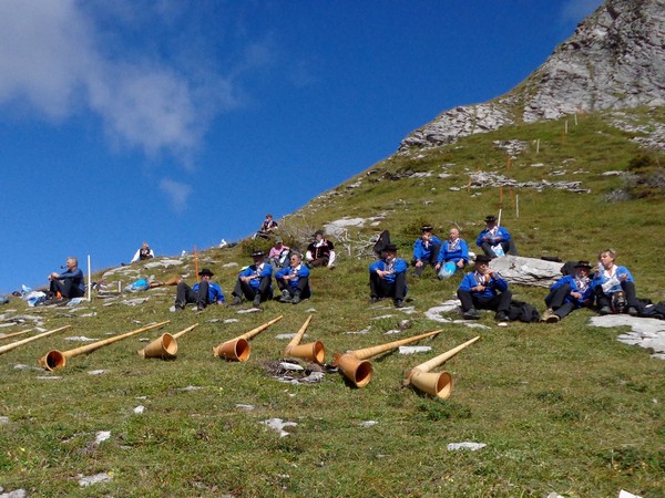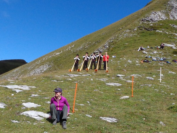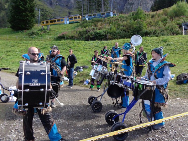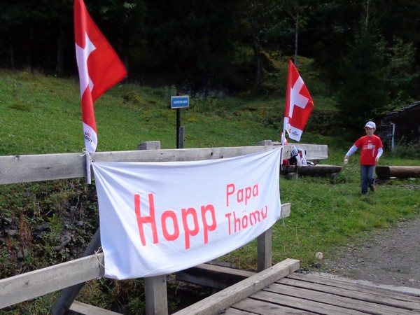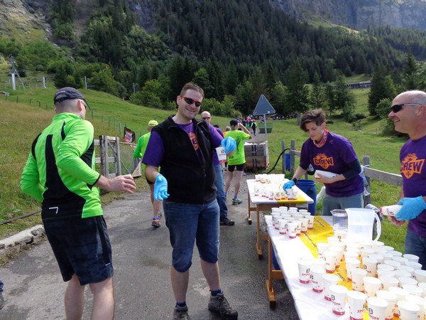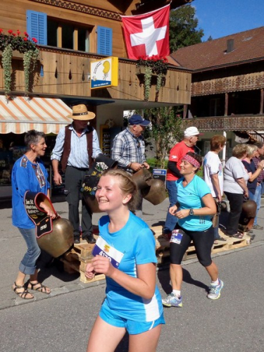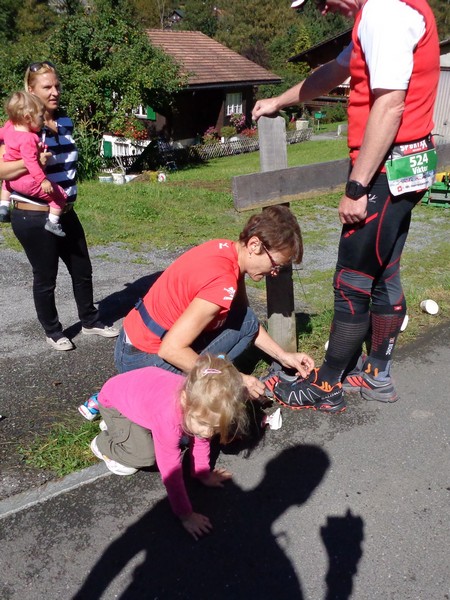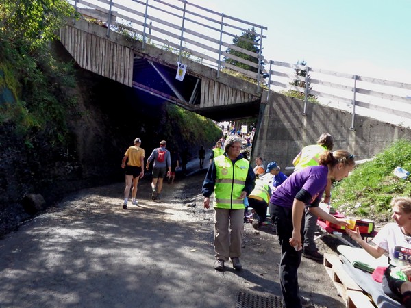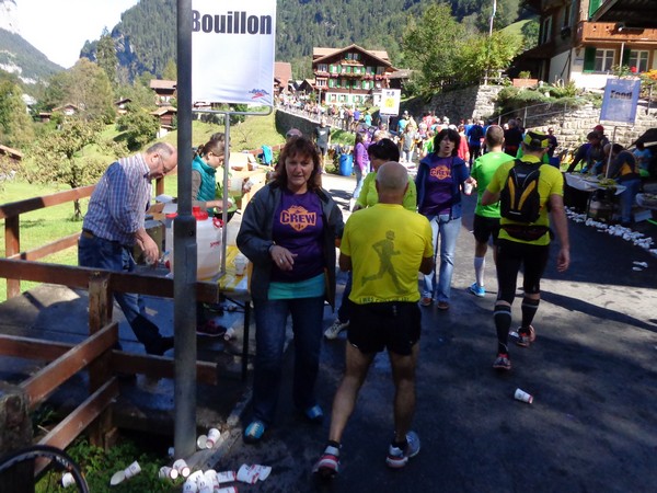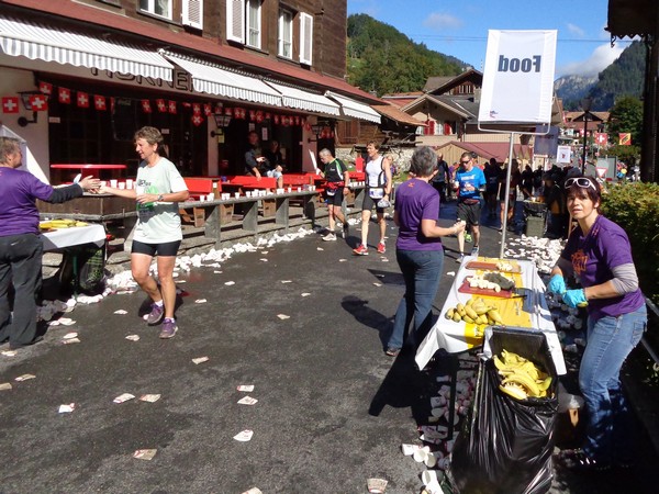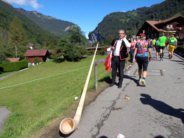 Nach km25, wieder in Lauterbrunnen, gibt es noch einmal Bouillon, Bananen, Energieriegel. Der Alphornbläser hat gerade Pause, es wird steil.