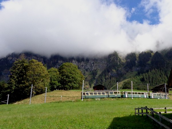 Hier ist es nicht durchgängig steil, immer wieder kann ich auch laufen und immer wieder diese prachtvolle Landschaft genießen! Oberhalb fährt gerade die Zahnradbahn, die von der Kleinen Scheidegg runter kommt. Man kommt sich vor, wie in einer Modelleisenbahnlandschaft. Alles ist friedlich und schön sauber.
