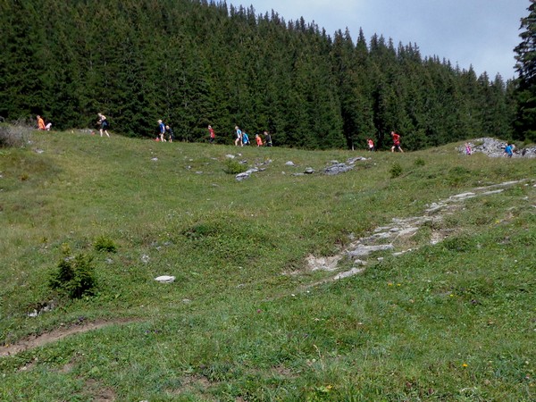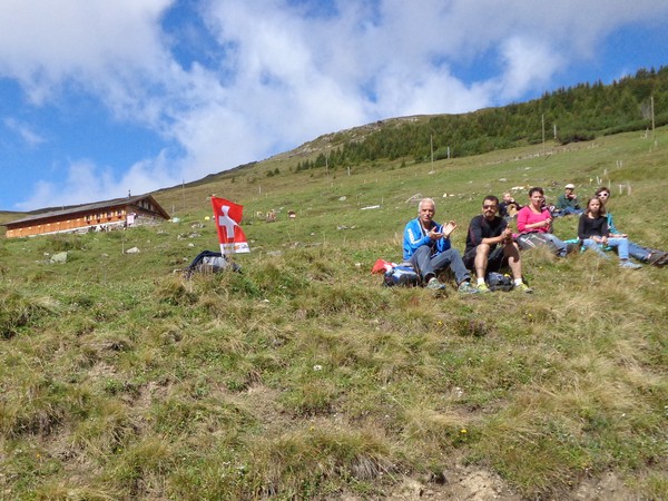 Wenn ich mich umdrehe, sehe ich unter mir eine Karawane bunt gekleideter Sportler, rechts das weiße, vergletscherte Bergmassiv. Über mir der blaue Himmel, rechts grüne Almen, was für ein Bild!