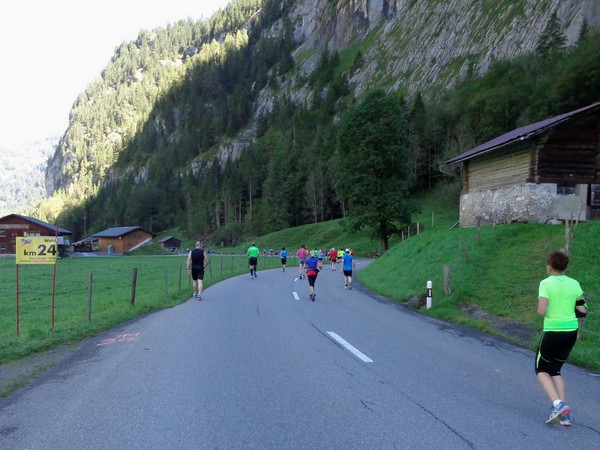 Die Strecke führt uns an die schattige Uferseite, die Steelband spielt von OMD „Joan of Arc“, wenn ich mich nicht täusche. Die machen das echt gut. Km24, leichtes Gefälle nun. Hier verliert mein Laufcomputer den Kontakt zum Satelliten. Die Sonne scheint gerade erst die Hubschrauberbasis erreicht zu haben, auf den Scheiben des Helis ist nach Raureif. Nun in der Sonne am rechten Ufer die Weisse Lütschine runter, es wird bald ernst werden.
