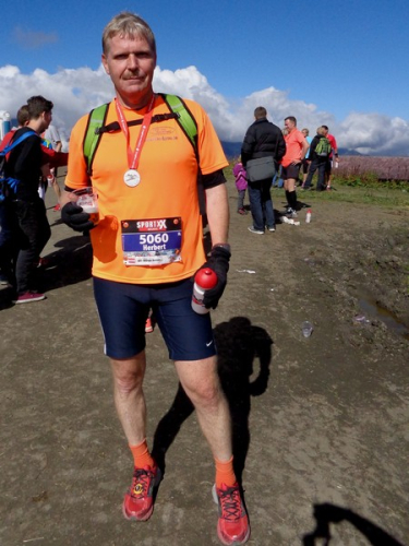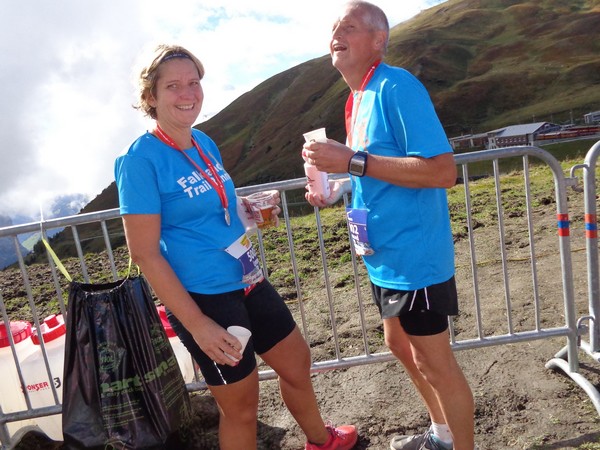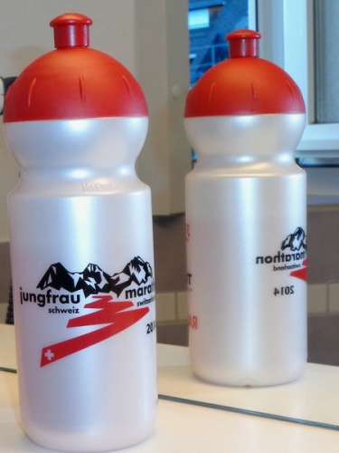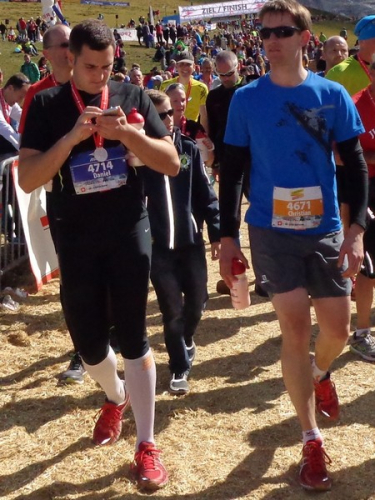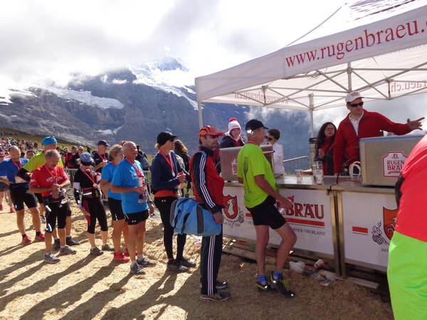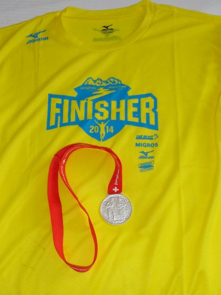 Ich bleibe noch im Zielraum um einige Fotos der Neuankömmlinge zu schießen. Iso von Sponser gibt es in Plastikflasche mit dem Logo des Jungfrau-Marathons drauf und alkfreies Bier vom Rugenbräu. Auf die Medaille, die ich nun umgehängt bekomme, bin ich besonders stolz.