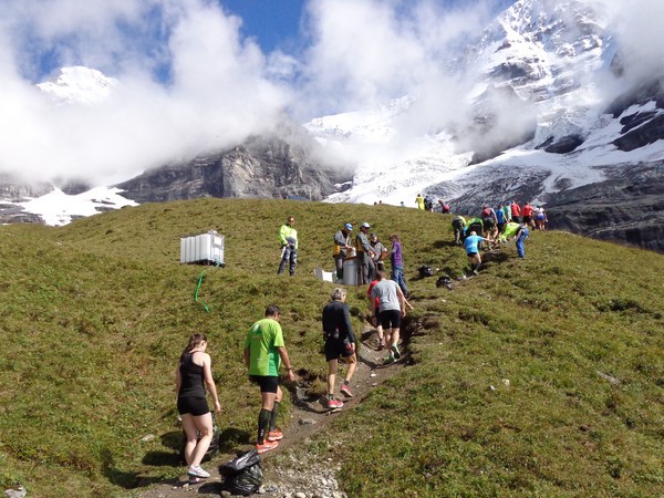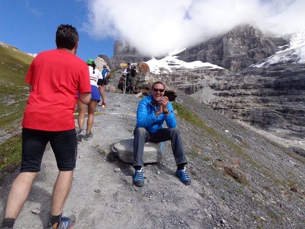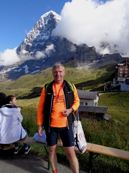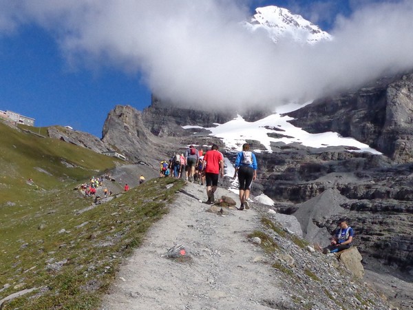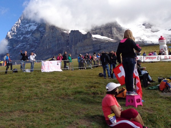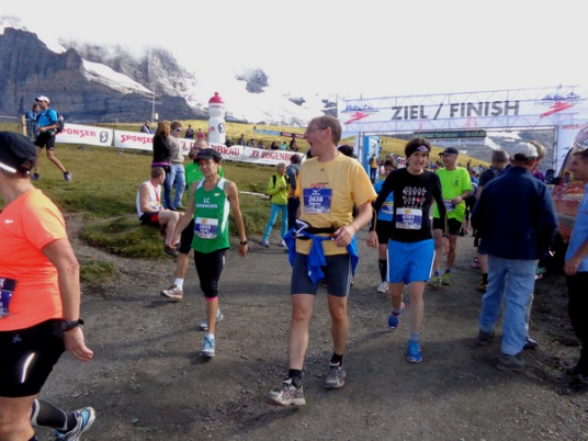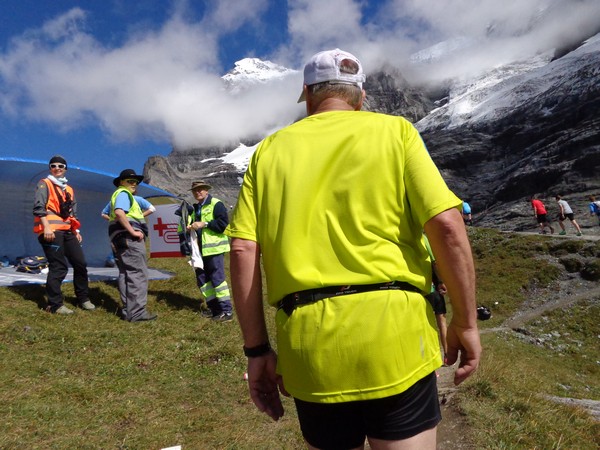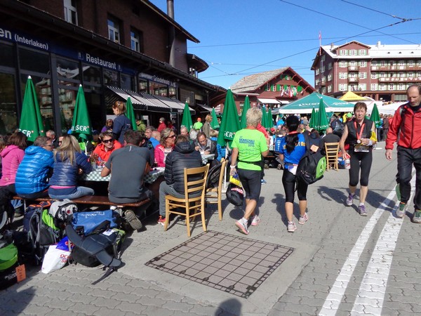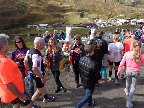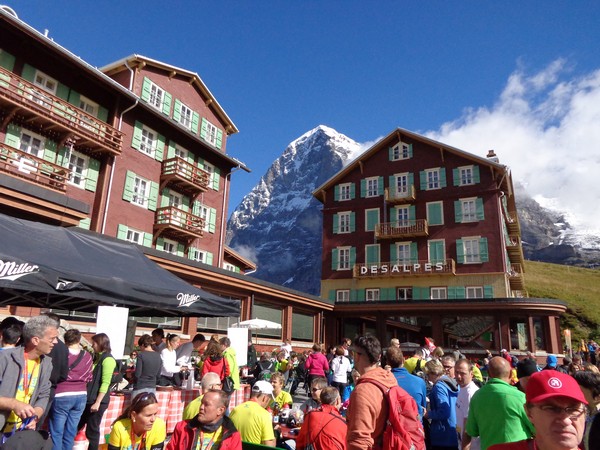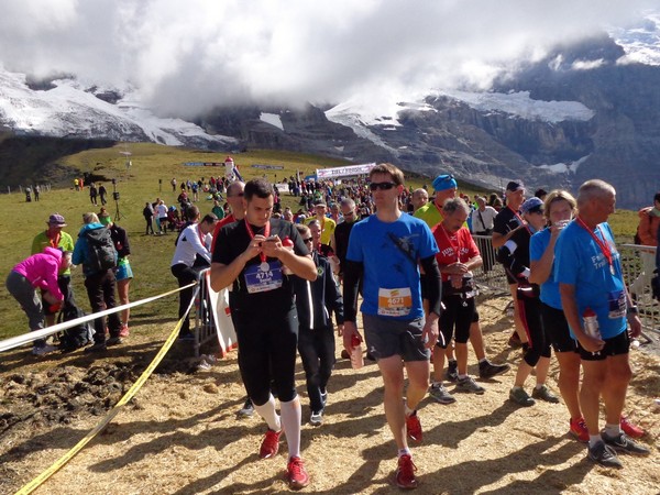 Um mich strahlende Gesichter, die Finisher lachen mit ihren Freunden um die Wette. Die berühmte Eiger-Nordwand ist ein beliebter Hintergrund für Erinnerungsbilder. Ein Stück des Weges runter wird mir der Zeitnehmungschip von der Startnummer abgenommen, dafür bekomme ich ein knallgelbes Finishershirt.