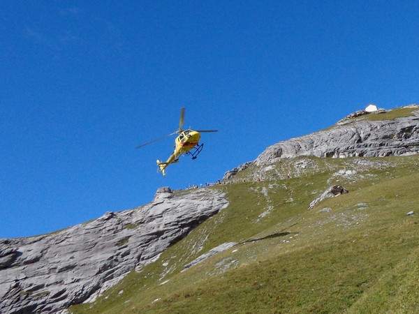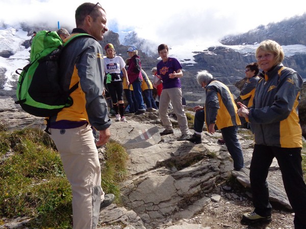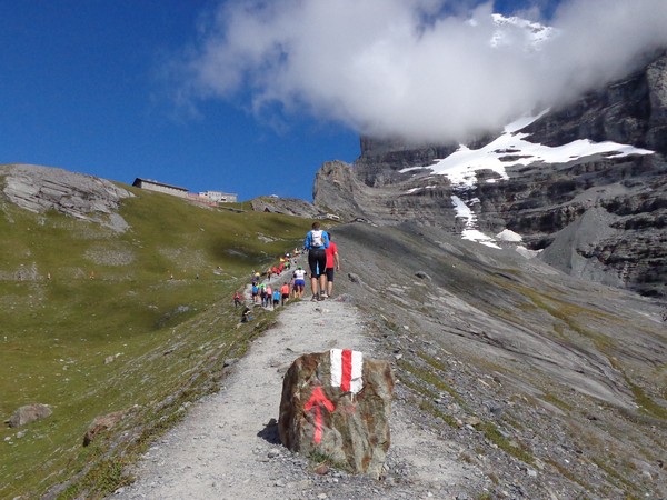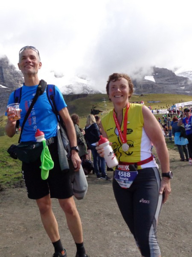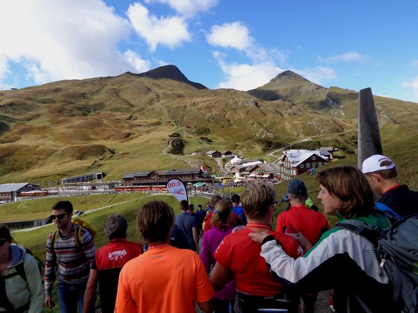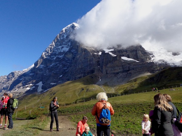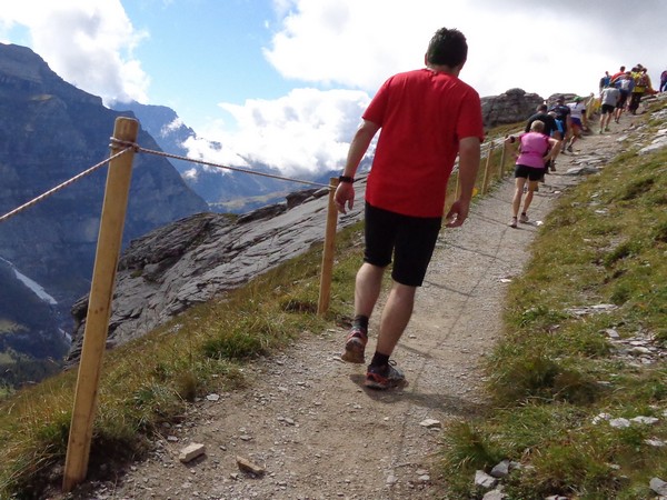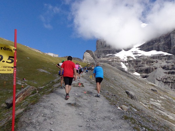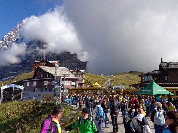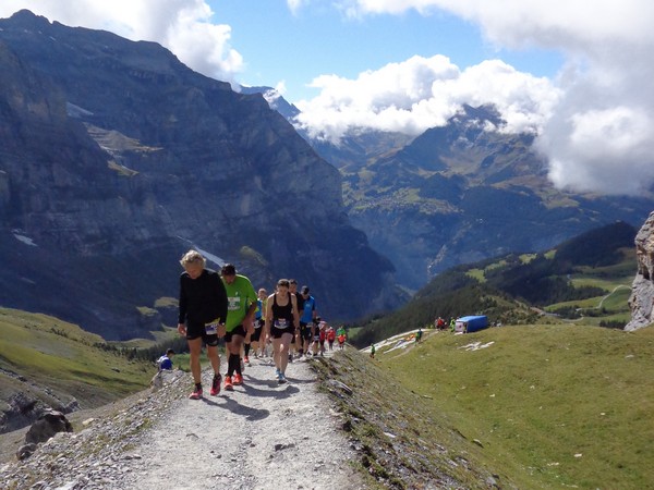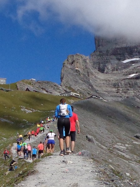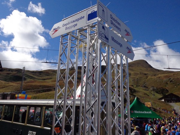 Um mich strahlende Gesichter, die Finisher lachen mit ihren Freunden um die Wette. Die berühmte Eiger-Nordwand ist ein beliebter Hintergrund für Erinnerungsbilder. Ein Stück des Weges runter wird mir der Zeitnehmungschip von der Startnummer abgenommen, dafür bekomme ich ein knallgelbes Finishershirt.