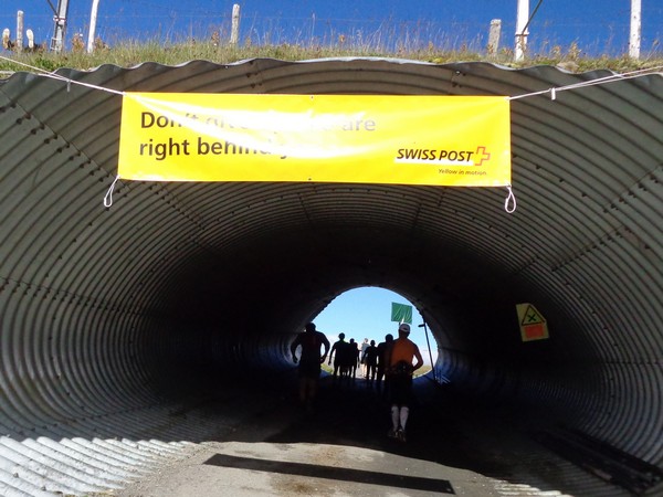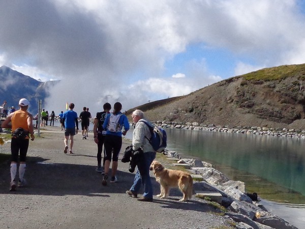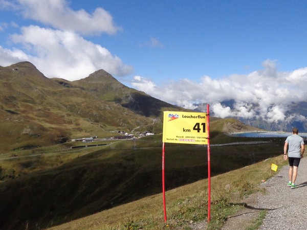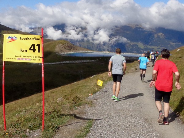 Abzweigung Wixi (km37,9), leichtes Gefälle zur üppig bestückten nächsten Labestelle auf 1.830m. Weiter geht es auf einem Single-Trail. Uns entgegenkommende Wanderer haben ihre Probleme. Einige haben kapituliert, sitzen am Streckenrand und warten, bis der Ansturm vorbei ist. Andere stehen mit suchenden Blicken neben der Strecke. Ich habe ständig die Fersen meines Vordermannes im Auge, trete dahin, wo seine Schuhe gerade waren.