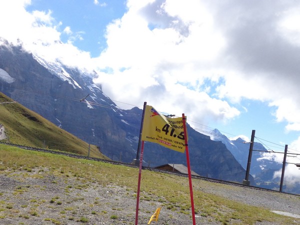 Dann führt der Weg über eine Felsnase, hier stehen Helfer bereit und reichen einem die Hand. Wie beim Triathlon, wenn man aus dem Wasser kommt. Schokoladestücke und Trockenobst liegt auf Tellern bereit. Links fällt es senkrecht ab, rechts wird der Weg breit und es geht runter. Der Bergbahnhof auf der Kleinen Scheidegg ist schon zu erkennen, vorher muss das Ziel sein. Der Speichersee lockt mit herrlich grünem Wasser, daran muss ich noch vorbei. Ich kann voll da runter laufen und habe eine Mords Freude daran. Als hätte ich gerade aufgewärmt und wäre nicht schon mehr als sechs Stunden unterwegs.