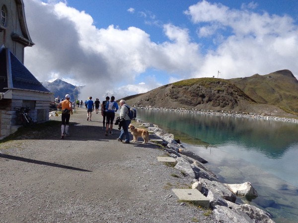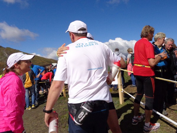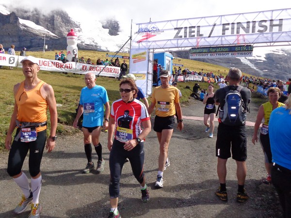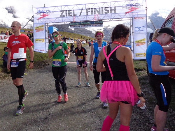 Ich sprinte runter zum See, vorher geht es durch einen kurzen Tunnel mit einem kleinen Anstieg. Ein paar Fotos noch: vom See, von mir, von der Bahn aufs Jungfraujoch. Dann hält mich aber nichts mehr. Das Zuschauerspalier wird immer dichter, Applaus, Applaus, und ich laufe, ich laufe, ich fühle mich wie auf Wolken und bin im Ziel und will gar nicht aufhören, so schön ist es. Schade, dass es schon vorbei ist.