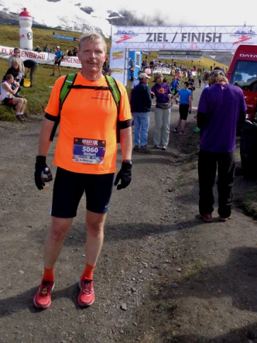 Ein Hubschrauber fliegt davon. Ich bin auf der Moräne, links und rechts geht es runter und ich steuere schnurstracks auf den Dudelsackspieler zu. Vor ihm sitzt einer und ruft „Aufschließen!“ und lacht und schlägt sich in die Hände. Mein Garmin zeigt mir, für den letzten km habe ich 22(!)min gebraucht. Das kann einem schon den Schnitt ruinieren.