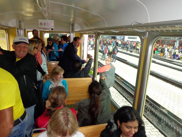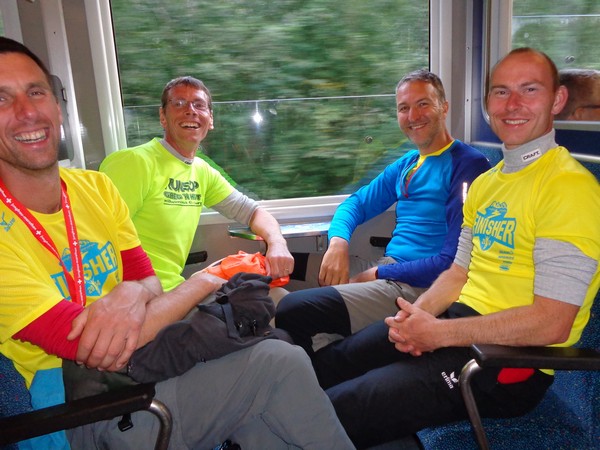 Gleich vier voll besetzte Zuggarnituren fahren gleichzeitig runter. Auf der einen Seite via Wengen nach Lauterbrunnen, auf der anderen Seite nach Grindelwald. Dort habe ich gleich Anschluss nach Interlaken und sehe nun Zweilütschinen von der Bahn aus. Die Startnummer gilt als Fahrkarte. Vier junge Holländer im Zug sind ebenfalls bester Laune. Klar hat es denen auch gefallen, geht ja gar nicht anders. Die Veranstaltung ist perfekt organisiert und der Wettergott hat das richtige Wetter geliefert. So wie Mr. Marathon4you, Klaus Duwe, es bestellt hatte.