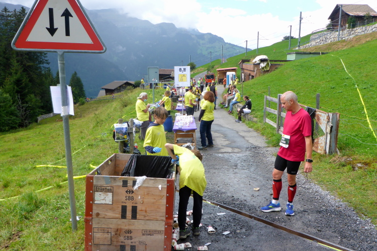 Wir passieren Zweilütschinen mit dem dritten VP, zwei Sorten Iso, verschieden Energieriegel und reichlich Wasser stehen bereit. Ich stelle fest, dass die Kilometer nur so dahinfliegen, aber leider die Zeit ebenso. Das hier ist kein Urlaubsspaziergang, sondern es gilt, ein Race zu schaffen, welches mir mit seinen Cut-offs doch Sorgen macht.