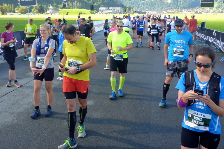 Ich bin früh genug dran, um mir den 10:15 Start anzuschauen. Ein Speaker sorgt für Stimmung, The final Countdown klingt aus und die Schweizer Nationalhymne wird angestimmt. Ein Startschuss und die vorletzten 500 machen sich auf den Weg. Für mich gibt es noch einen Eiweißriegel, während ich über das Gelände schlendere und mir noch etwas zu trinken hole. Ein Bild vorab an Klaus im M4Y-Headquarter ist auch noch drin. Die Nervosität steigt an und ich genieße Sonnenschein und einen zu 80% blauen Himmel. Dies war anders zu erwarten, die Wettervorhersage machte uns keine Hoffnung, trocken zu bleiben. Jetzt sind „nur“ noch für 12 und 17 Uhr Gewitter angekündigt. Meine Zeit ist gekommen, der letzte Startblock wird an die Linie gebeten. Ich genieße es mal, mich in die erste Reihe zu stellen. So kann ich voran stürmen und noch einige Fotos schießen, bevor sich das Starterfeld auseinanderzieht. Unser Block scheint mir kleiner zu sein, das sind keine 500 mehr, die hier versammelt sind. Bevor wir aber loslaufen, werden informiert, dass die ersten Drei im Ziel sind. Ein komisches Gefühl, mit diesem Wissen noch hier zu stehen. Pünktlich fällt der Startschuss und zum ersten Mal erwarten mich respektvolle 2000 Höhenmeter in den wunderschönen Schweizer Bergen.