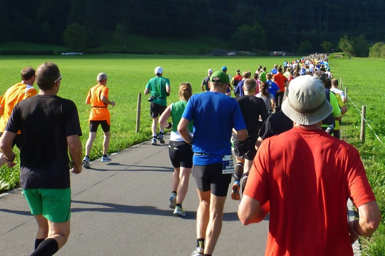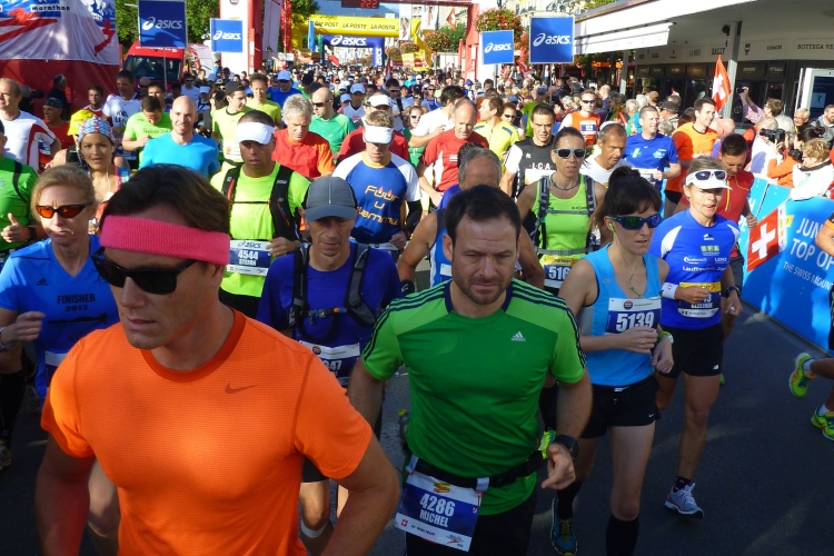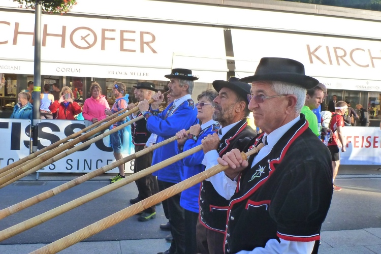 Alphornbläser stimmen uns musikalisch ein, bevor die Nationalhymne, der „Schweizerpsalm“, erklingt. Den Text gibt es in vier Sprachen. Ein lauter Böllerschuss und schon gehen über 4.000 Starterinnen und Starter beim 23. Jungfrau-Marathon auf die Strecke. Viele davon sind „Wiederholungstäter“, vier sogar schon zum 25. Mal dabei. Wie das sein kann? In den Jahren 2002 und 2012 wurden an einem Wochenende jeweils zwei Rennen durchgeführt, um noch mehr Läufern die Teilnahme zu ermöglichen.