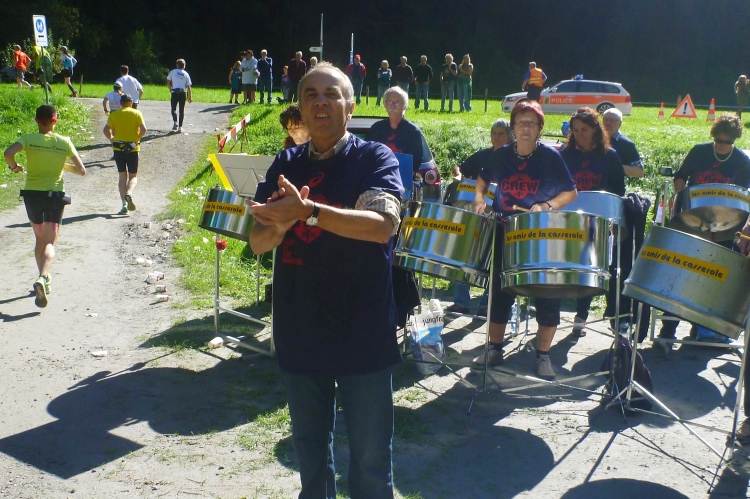 In Gsteigwiler noch eine Stimmungshochburg mit einer Örgeler (Akkordeon)-Gruppe, bevor wir auf einem schönen Wanderweg entlang der Lütschine weiter laufen. Vor uns ein Pärchen aus Sri Lanka. Wenigstens kommen mir die Trikots mit dem Löwen so vor. Judith macht mich darauf aufmerksam, dass es sich wohl eher um einen Drachen, das Wappentier von Wales, handelt. Die Startnummer zeigt denn auch die Nationalflagge von Großbritannien. Mit den beiden werden wir uns auf den nächsten 20 Kilometern noch oft bei der Führungsarbeit in unserem Grüppchen abwechseln. Auch Kirsten hält sich in unserer Nähe.