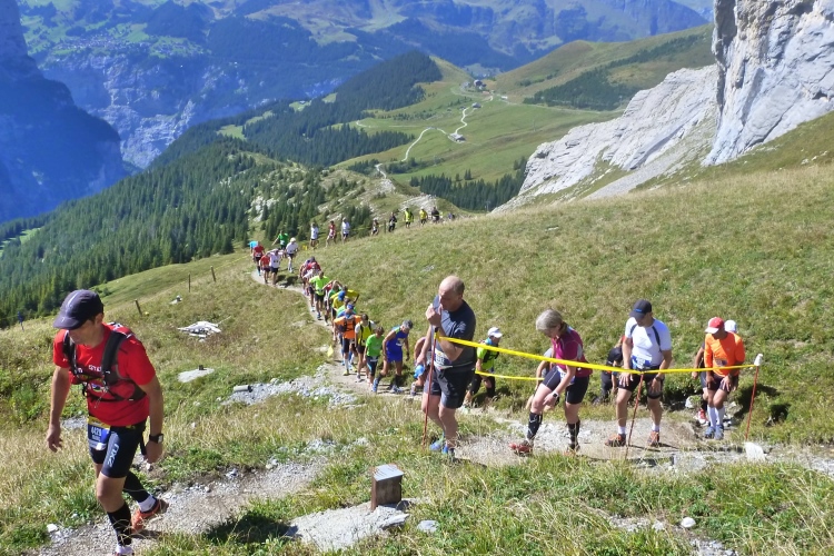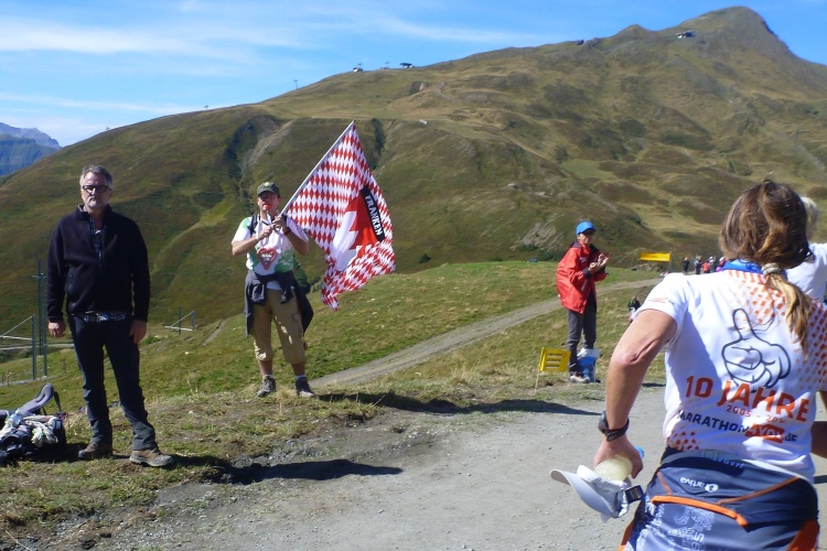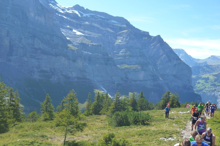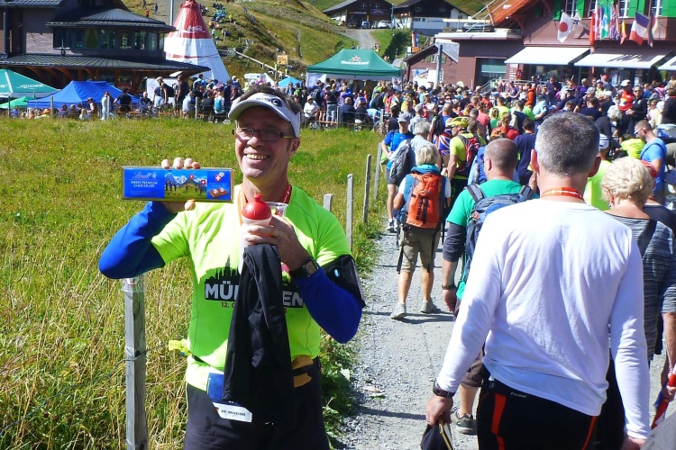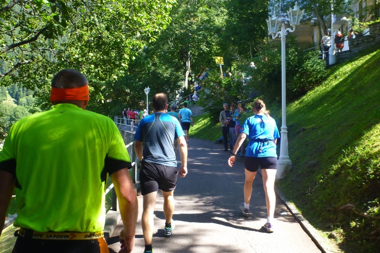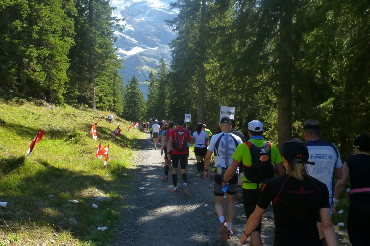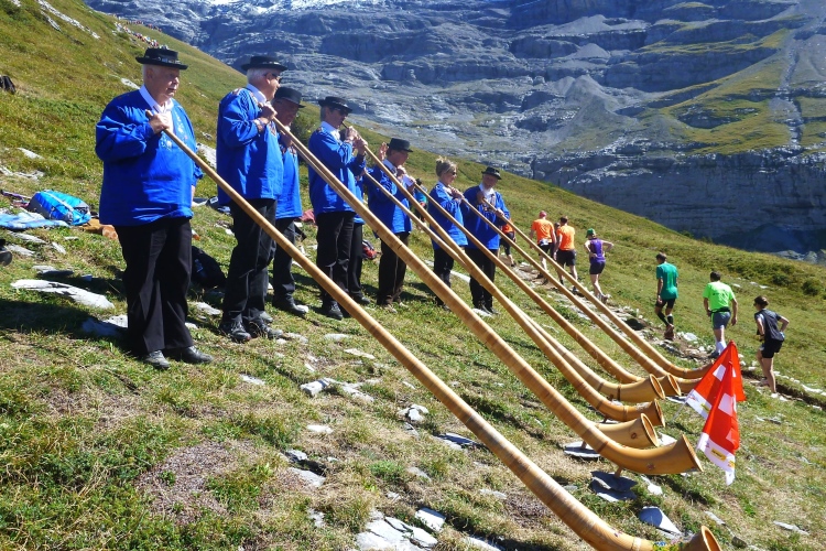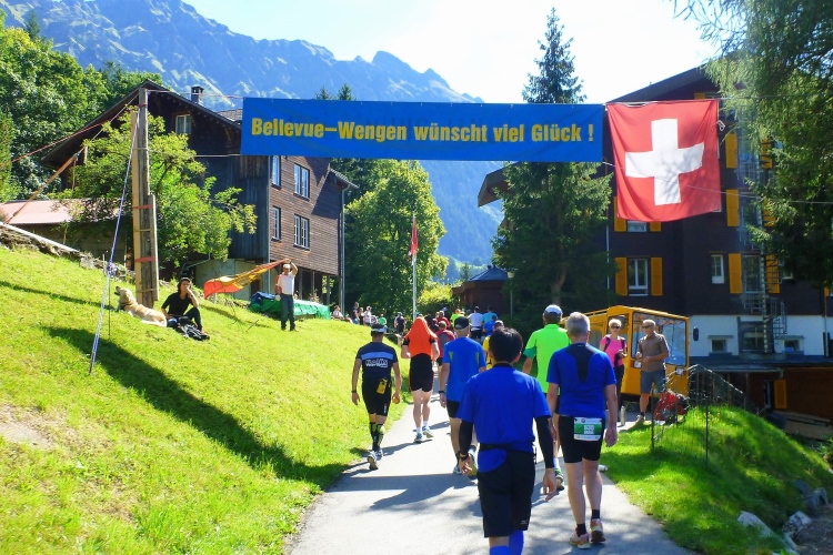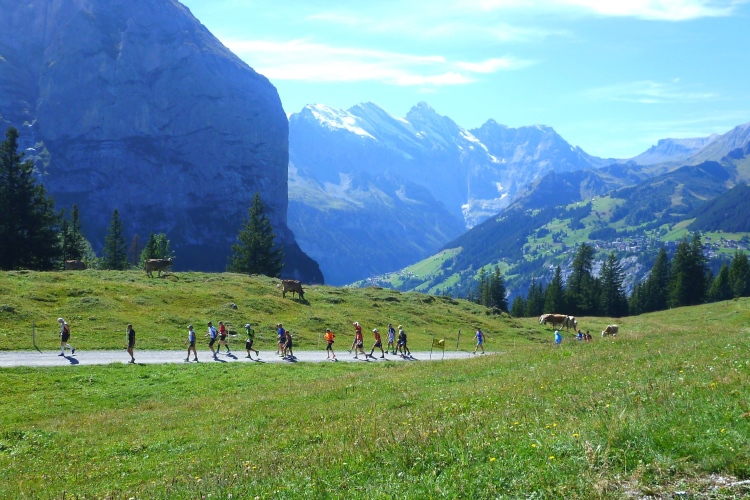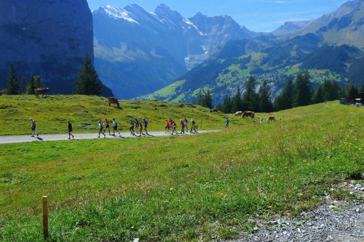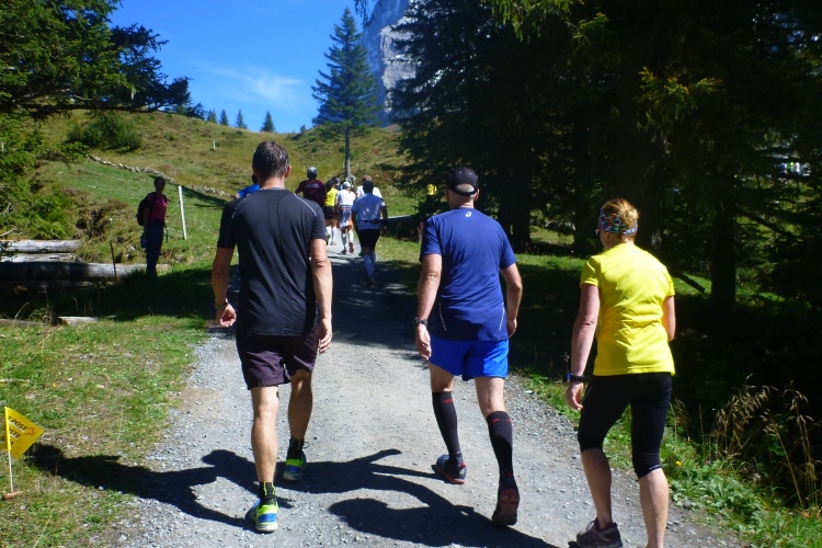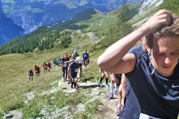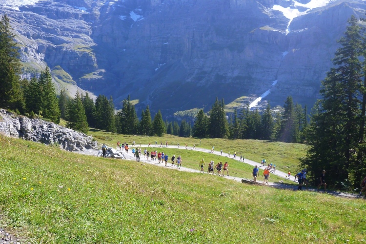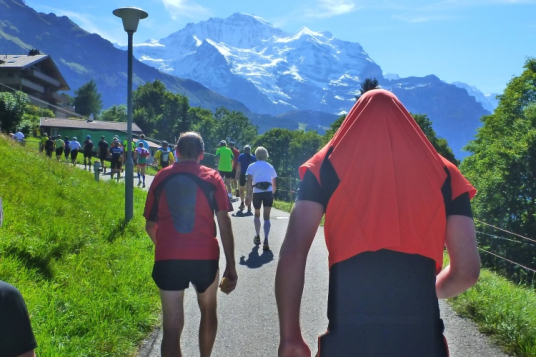 Bei der Steelband „Les amis de la casserole“ machen wir eine Kurve. Im Schatten der steilen Wand heißt es noch mal richtig Gas geben, bevor wir wieder nach Lauterbrunnen kommen und bei Kilometer 26 mit dem nächsten Abschnitt des Marathons beginnen: In engen Serpentinen führt uns der Wanderweg nach oben, begleitet von dem Radau der Kuhglocken, die einheimische Kinder - sicherheitshalber mit Ohrenstöpseln versehen – am Ende ihrer Sommerferien für uns schwingen. Jetzt bieten sich schöne Ausblicke ins Tal. Weiter oben wird es viel ruhiger. Nur noch angestrengtes Schnaufen ist zu hören. Gelegentlich veranlassen mich Zuschauer zu einer launigen Bemerkung. Kein Marschierer reagiert. Beerdigungslauf nenne ich so etwas. Aber vielleicht bin ich auch nicht mit dem nötigen Ernst bei der Sache, denn wer Witze macht, hat bekanntlich noch Reserven – haha.