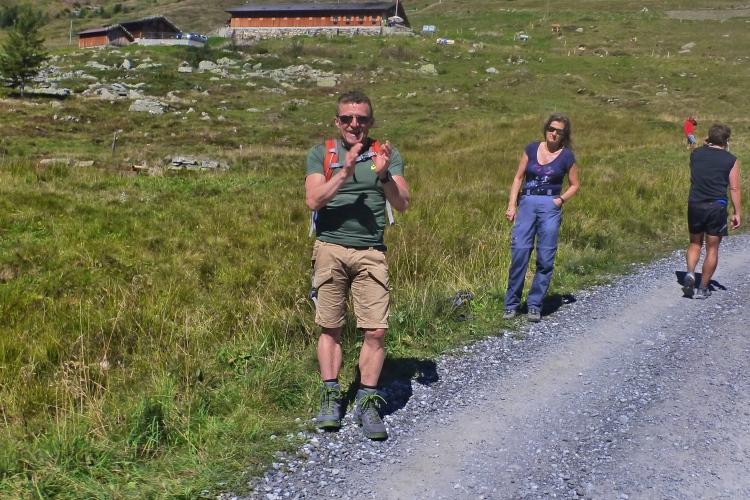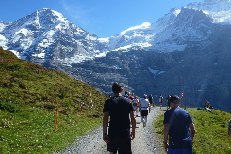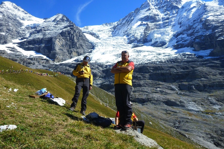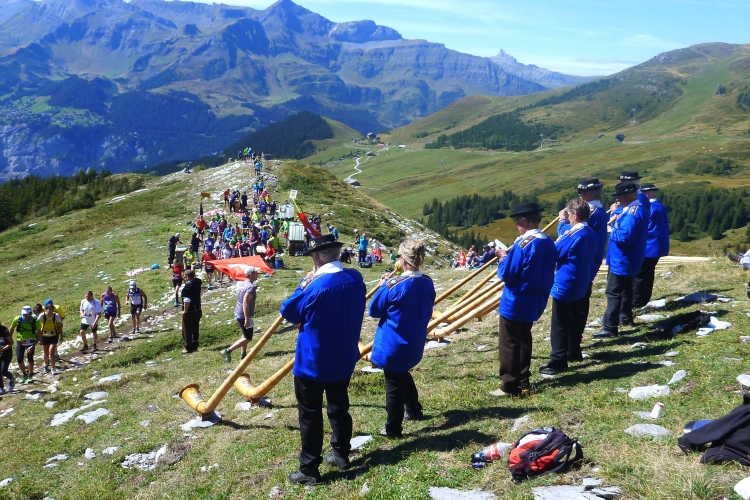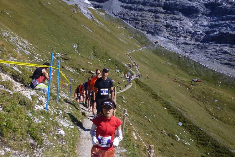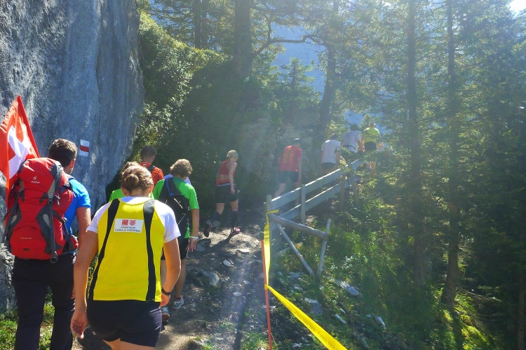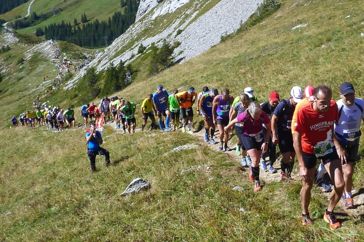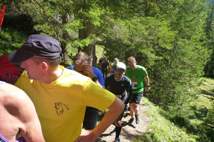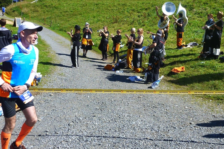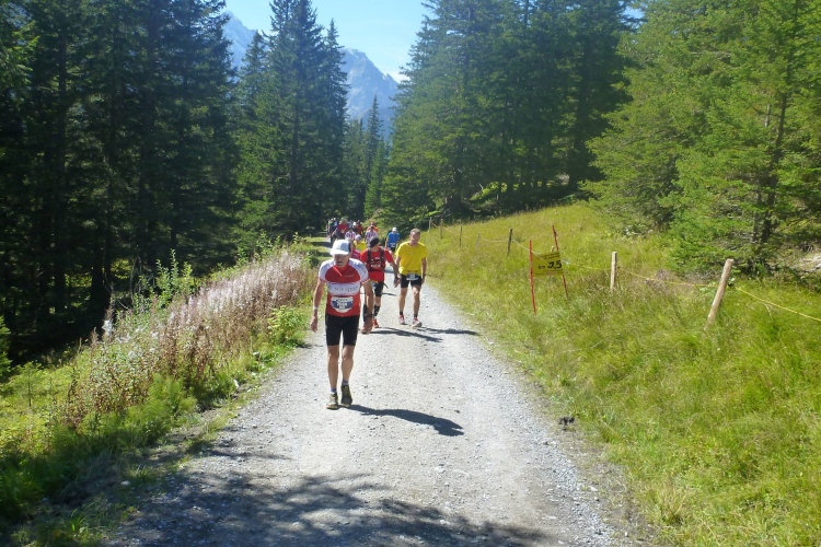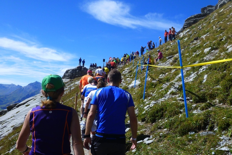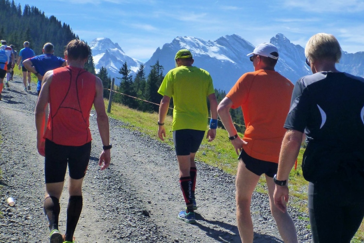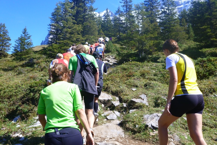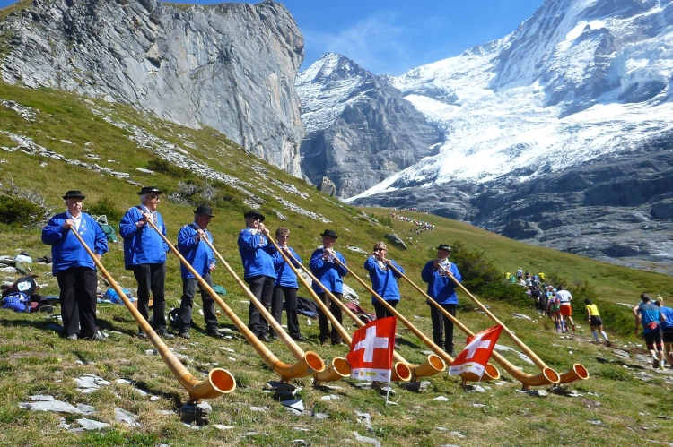 Bei der Steelband „Les amis de la casserole“ machen wir eine Kurve. Im Schatten der steilen Wand heißt es noch mal richtig Gas geben, bevor wir wieder nach Lauterbrunnen kommen und bei Kilometer 26 mit dem nächsten Abschnitt des Marathons beginnen: In engen Serpentinen führt uns der Wanderweg nach oben, begleitet von dem Radau der Kuhglocken, die einheimische Kinder - sicherheitshalber mit Ohrenstöpseln versehen – am Ende ihrer Sommerferien für uns schwingen. Jetzt bieten sich schöne Ausblicke ins Tal. Weiter oben wird es viel ruhiger. Nur noch angestrengtes Schnaufen ist zu hören. Gelegentlich veranlassen mich Zuschauer zu einer launigen Bemerkung. Kein Marschierer reagiert. Beerdigungslauf nenne ich so etwas. Aber vielleicht bin ich auch nicht mit dem nötigen Ernst bei der Sache, denn wer Witze macht, hat bekanntlich noch Reserven – haha.