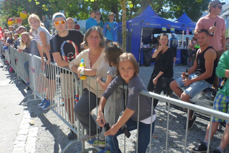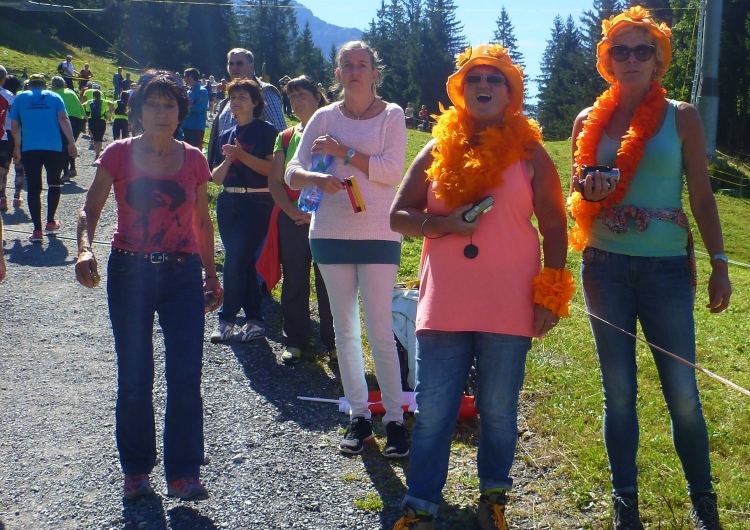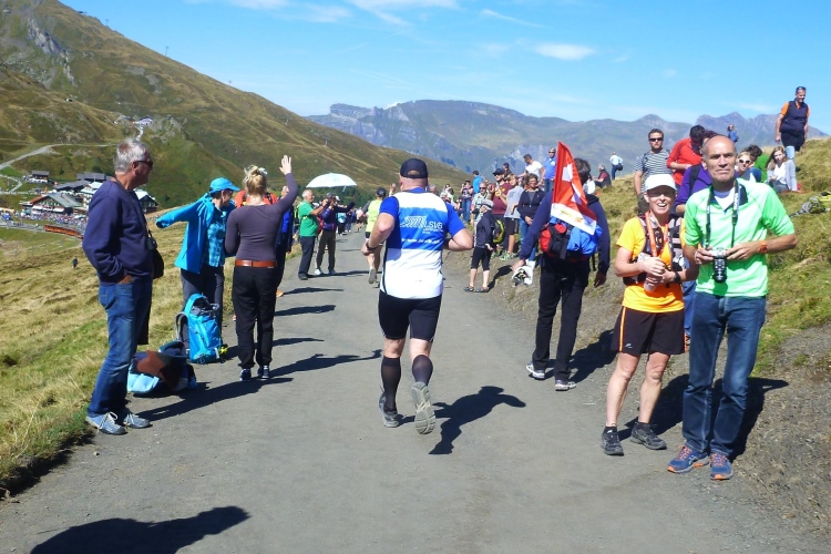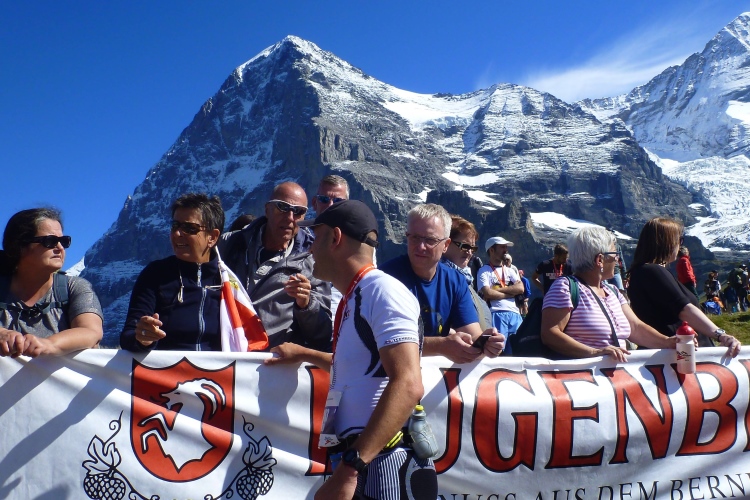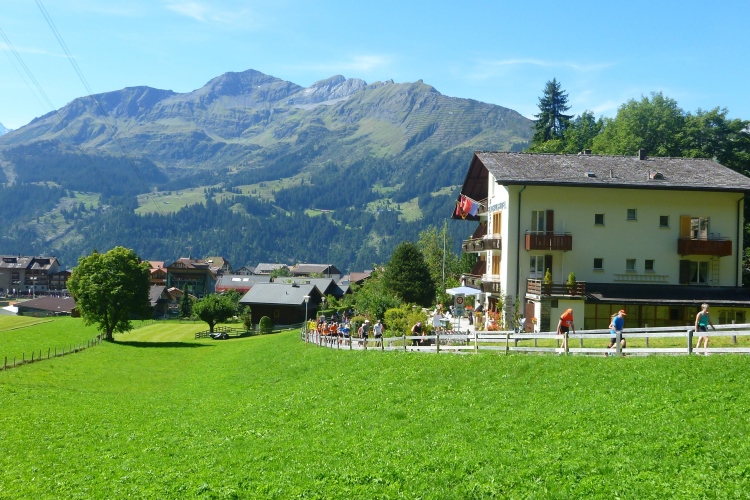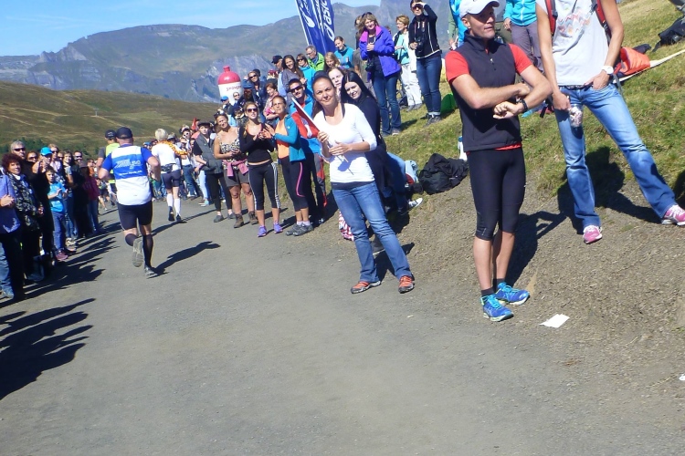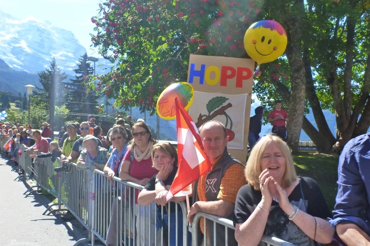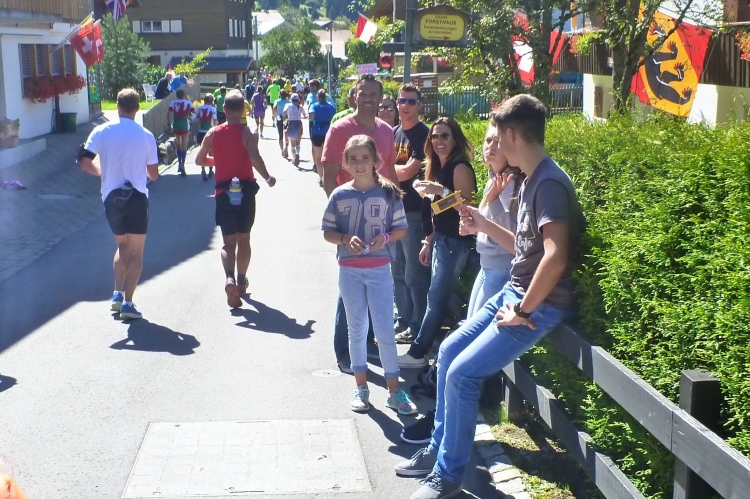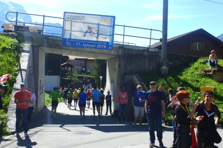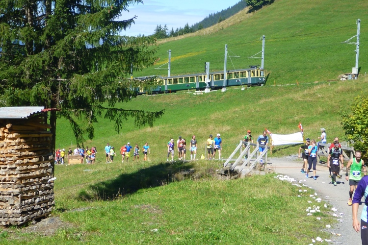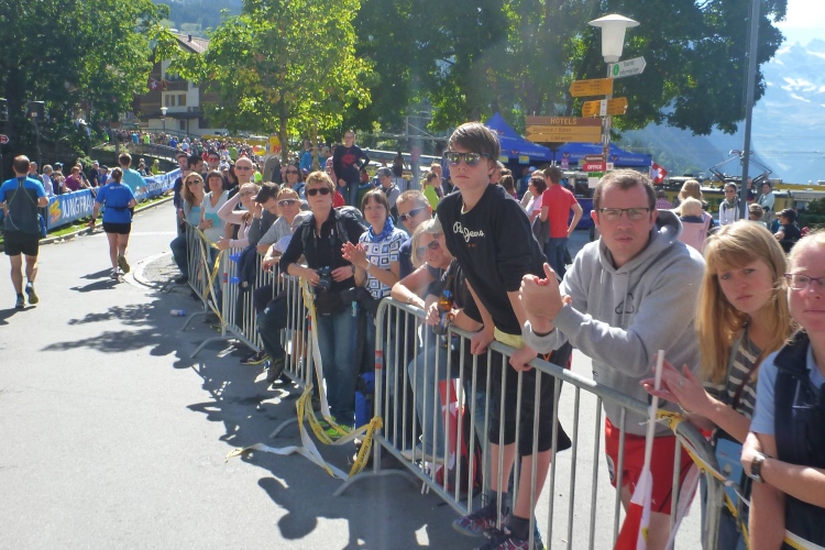 Zusätzlich zu den Einwohnern haben sich viele der 5.000 Sommer-Übernachtungsgäste am Wegesrand eingefunden. Für den M4Y-Chef waren wir wohl etwas zu langsam. Der ist mit der Bahn bereits Richtung Wengernalp unterwegs, der Spitzengruppe hinterher. Dafür gelingt es Judith und mir endlich, eine Dame im „Henkel“-Firmenlaufshirt zu überholen. Mit den „Drachen“ aus Wales ist das nicht so einfach.