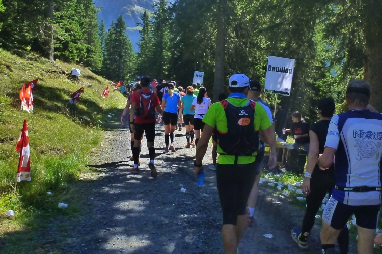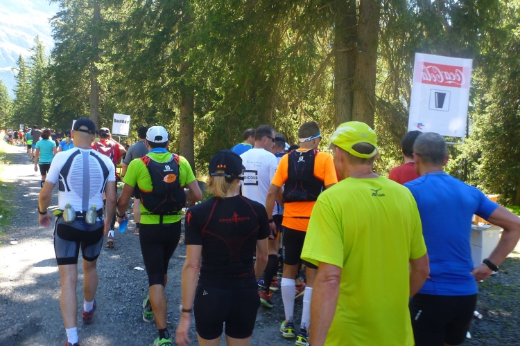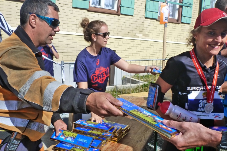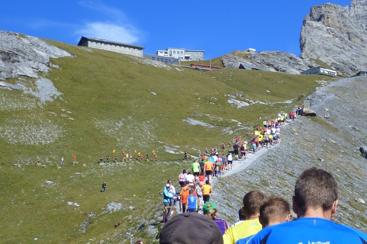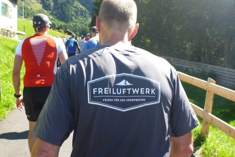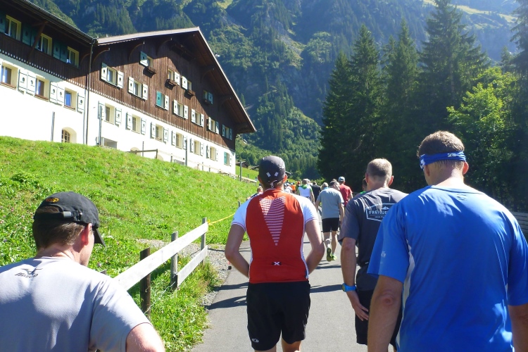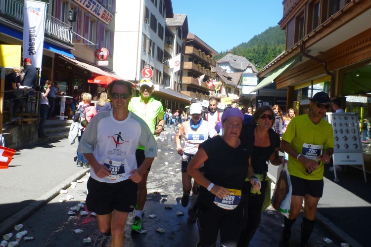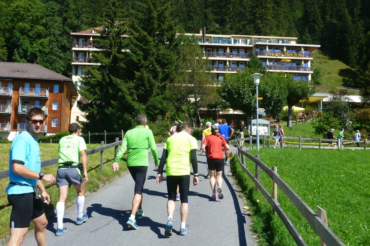 Wer sich über die Farben der Startnummern gewundert hat: Die orangefarbenen kennzeichnen Läufer aus dem hiesigen Kanton Berner Oberland, die roten die Eliteläufer (habe ich eher nicht gesehen), die blauen das Läuferfeld (also auch uns) und die grünen und goldenen die10- bzw. 20-maligen Finisher, für die eigens eine Apéro-Party veranstaltet wird.
