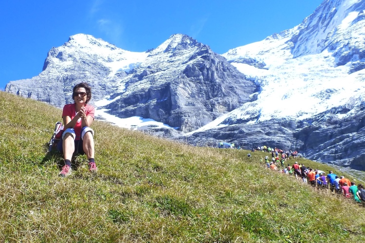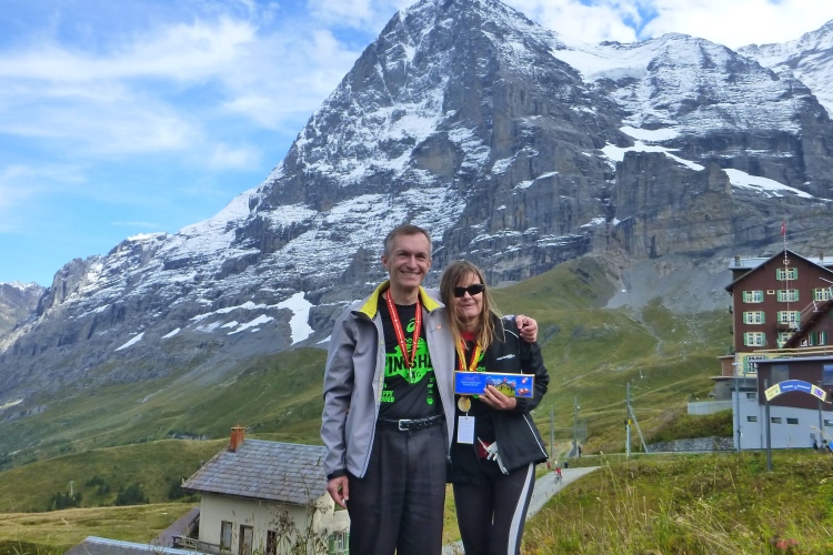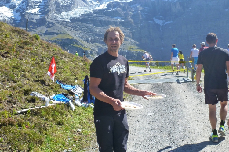 Einige Meter weiter erwarten uns die warmen Duschen. Massagen gibt es im Ziel ebenfalls, wie bereits mehrmals an der Strecke. Judith und ich entscheiden uns wegen des doch etwas knappen Zeitfensters gegen die Fahrt zum Jungfraujoch. Wir nehmen die nächste Bahn hinunter nach Lauterbrunnen. Über Grindelwald nach Interlaken wäre es in die andere Richtung gegangen. Aber so können wir noch einmal die Laufstrecke aus anderer Perspektive betrachten. Gerade rechtzeitig fällt mir noch ein, ein Foto mit der berühmten Eiger-Nordwand im Hintergrund zu schießen.
