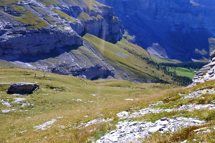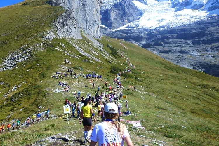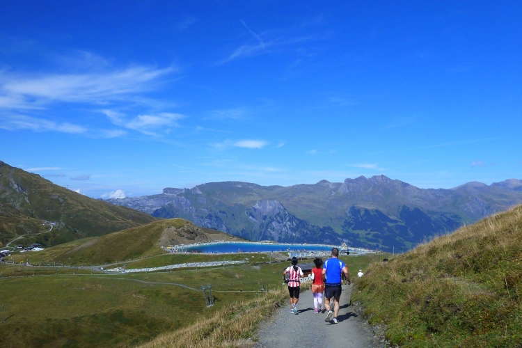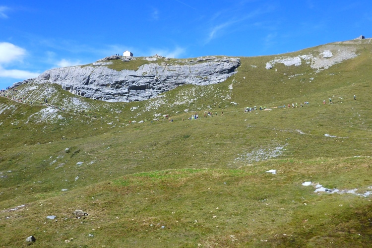 Links sieht man schon das Ziel, die Kleine Scheidegg. Unter uns bewegt sich eine weitere bunte Perlenkette von Sportlern in die gleiche Richtung. Wo kommen die denn her? Ganz einfach: Um größere Staus zu vermeiden, gibt es ab Wixi zwei Strecken bis Haaregg, auf die die Läuferinnen und Läufer bedarfsweise geleitet werden.