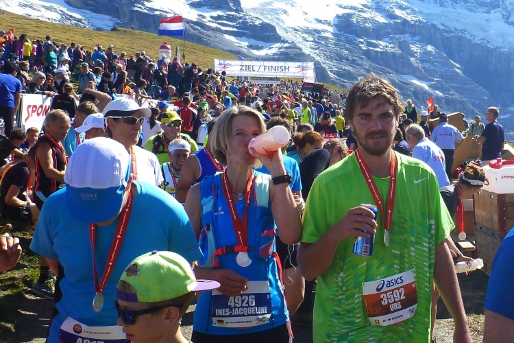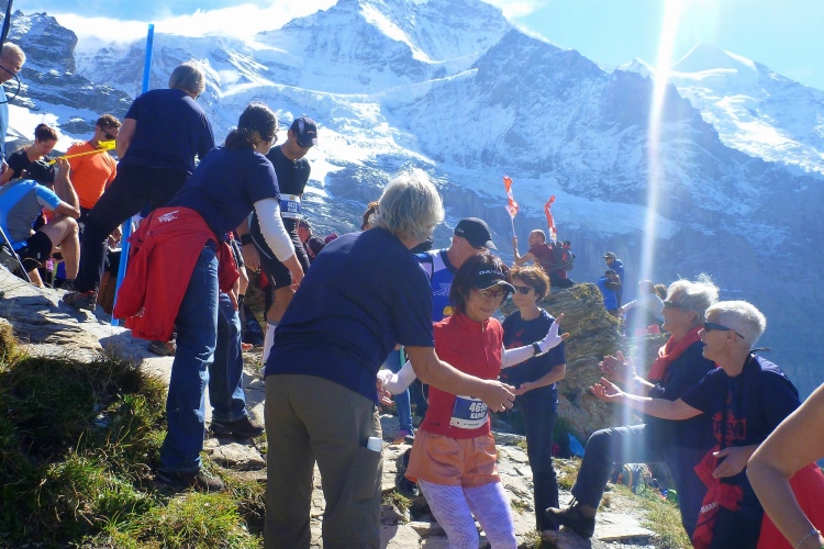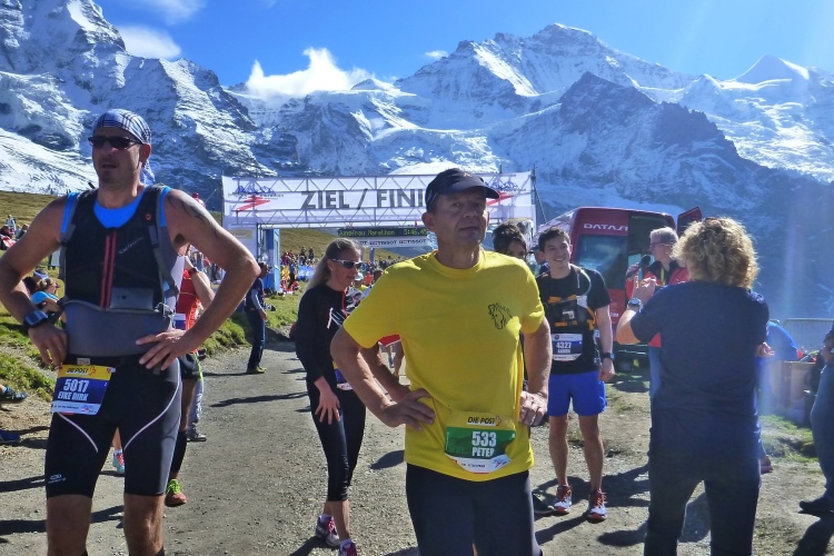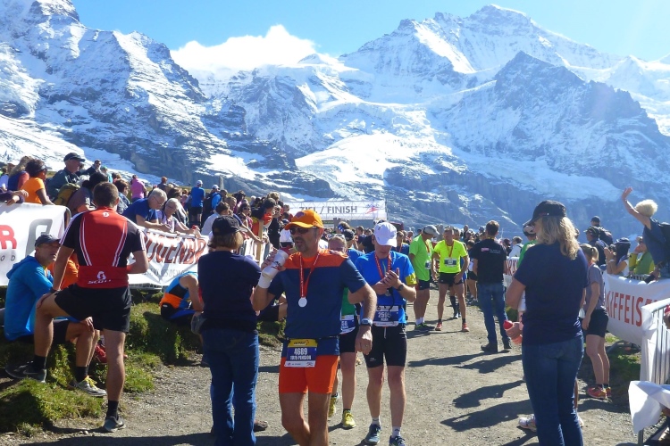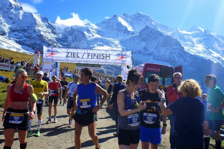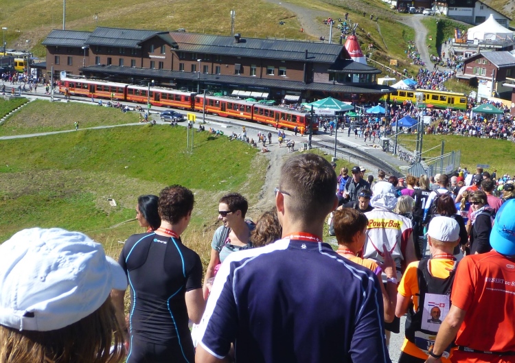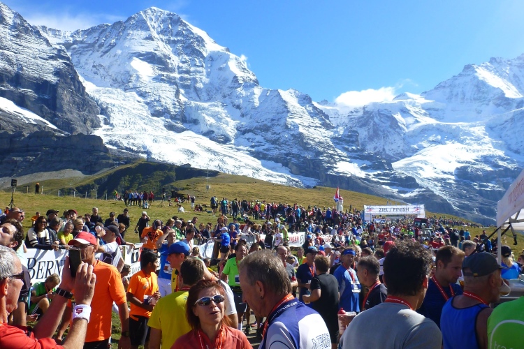 Vor dem Hotel Bellevue Des Alpes tauscht man den Zeitmesschip aus der Startnummer gegen ein „Finisher“-T-Shirt und eine 300-Gramm-Lindt-Schokoladentafel, die Judith jetzt in Rekordzeit verzehren könnte. Die letzte Musikgruppe spielt mit viel Temperament am Bahnhof Kleine Scheidegg auf. Die Gepäckstücke bekommt man in der Remise links hinter dem Bahnhofsgebäude.
