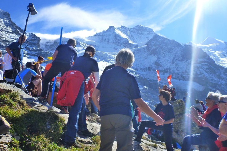 An der Station Allmend kann man gut das Betriebskonzept der Bergbahn erkennen: Bei großem Fahrgastaufkommen bewegen sich die Zahnradbahnen mit drei Einheiten auf Sicht hintereinander. Die Ausweichstellen sind lang genug für die drei Züge. Auch der Laie wird feststellen, dass heute drei Generationen von Zügen im Einsatz sind. Besonders schön sind die alten Triebwagen mit ihren Holzsitzen. Und auch von dort wird uns weiter zugejubelt – wobei sich nur die Asiaten etwas zurückhalten. Neben arabischen Urlaubern sieht man viele Chinesen. Russen eher weniger. Am Lauf nehmen auch Taiwaner und Japaner teil.