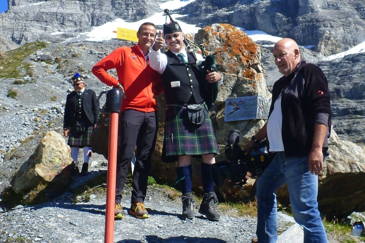 An der Wiedervereinigungs-Verpflegungsstelle (ein Wort so lang wie die Läuferschlange) gibt es köstliches Cola für den Schlussspurt und Alphornbläser für das Gemüt. Über die Moräne des Eigergletschers, einen geraden Weg auf einer Bergkante, geht es zum höchsten Punkt, der Loucherflue, wo wir mit Dudelsackmusik empfangen werden sollten. Dort ist der Teufel los. Christoph Seiler begrüßt gerade den Herrn im Kilt. Nach 15 Jahren als OK-Chef wurde Seiler zum Präsidenten von Swiss Athletics gewählt und übergibt die Leitung des Jungfrau-Marathons Ende 2015 an Toni Alpinice.