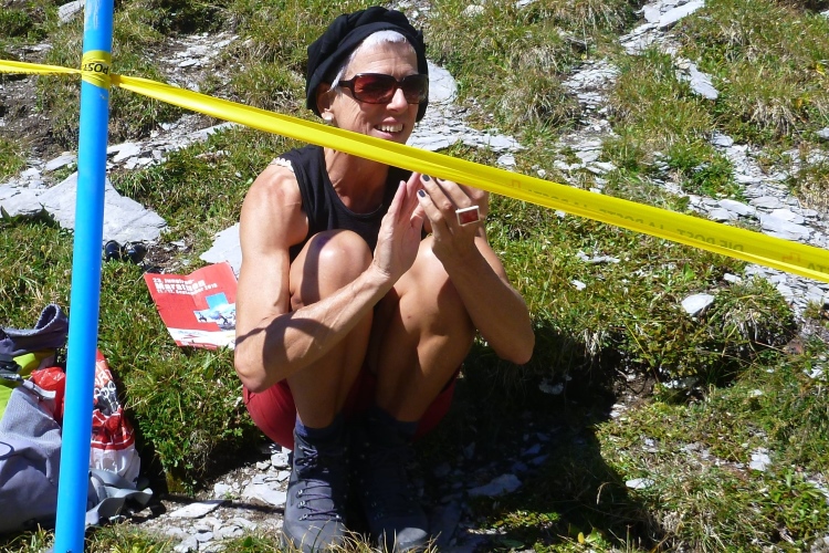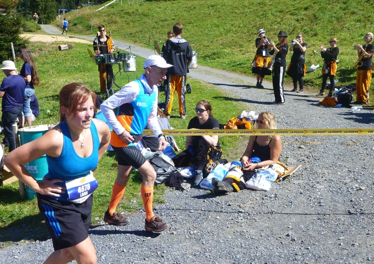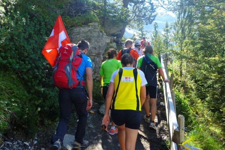 Vor uns eine lange Kette aus farbigen Punkten, die sich den Berg hinauf zieht. Wir müssen erst mal ein paar Höhenmeter mit Volldampf nach unten zur Wixi-Bergstation. Dank entsprechender Beschneiung in den Wintermonaten erfreut sich dieser Südhang bei den Skifahrern besonderer Beliebtheit. Wir können hier noch einmal auftanken. Die kommenden 1,3 Kilometer geht es über einen Bergweg erst im Wald über Wurzeln stetig hinauf. Leider für meinen Geschmack etwas zu langsam. Irgendwie haben die Glückshormone und die Aussicht aufs nahe Ziel viel Energie freigesetzt. Bald habe ich zu Judith aufgeschlossen. Nett die vielen gelben Fähnchen der Schweizer Post, die den Weg markieren.