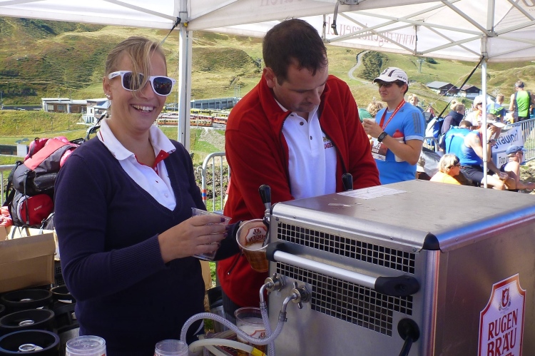 Noch 1,3 Kilometer: Kurz Speed auf einer Abwärtspassage. Dann anstehen vor einer kleinen Felskuppe. Zwei Meter geht’s bergab, bei Bedarf von Helfern gestützt. Und dann weiter mit Schwung. Unter den Gleisen der Jungfraubahn hindurch zu einem wunderschön glänzenden See. Baden ist hier verboten. Dafür gibt es einen Tümpel mit Sitzgelegenheit zum Füßeabkühlen. Noch 200 Meter zum Ziel. Die begleitenden Schlachtenbummler, darunter viele inzwischen bekannte Gesichter, feuern uns ein letztes Mal an. Nach 5:43 Stunden sind wir im Ziel. Eine schicke Medaille gibt es. Wirkt wie eine teure Silbermünze. Alkoholfreies Bier aus dem Berner Oberland wartet auf uns, ebenso eine mit Iso gefüllte Trinkflasche mit Jungfrau-Marathon-Logo.