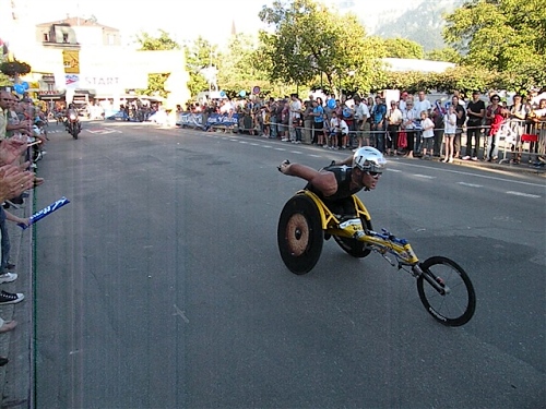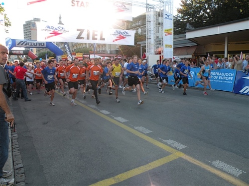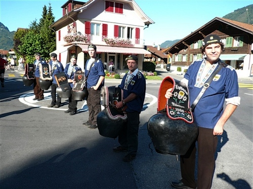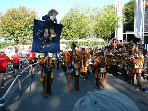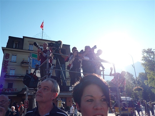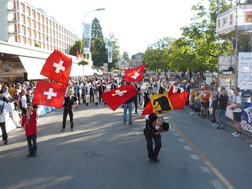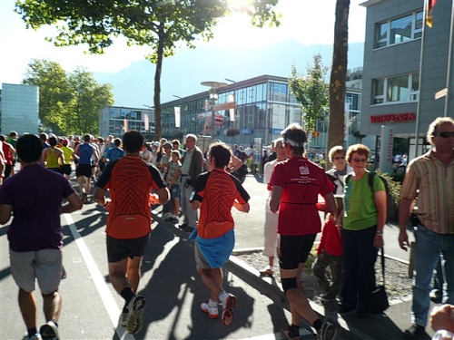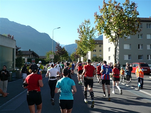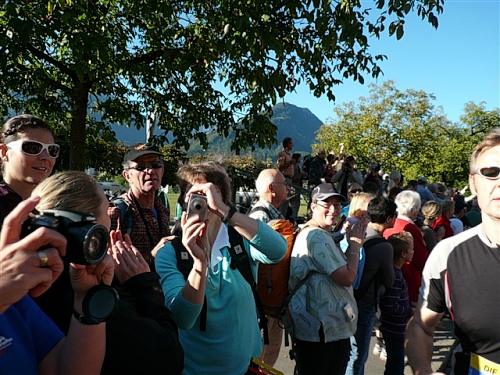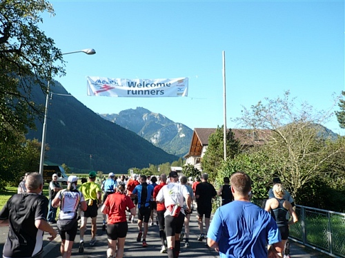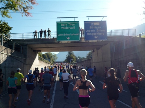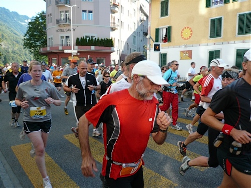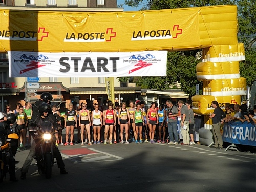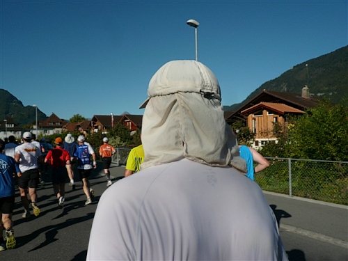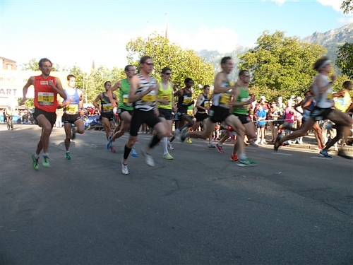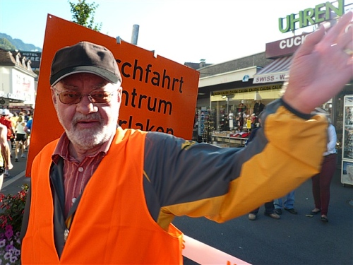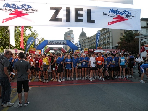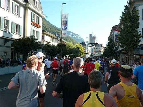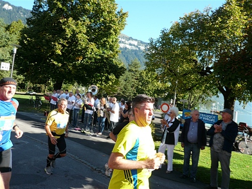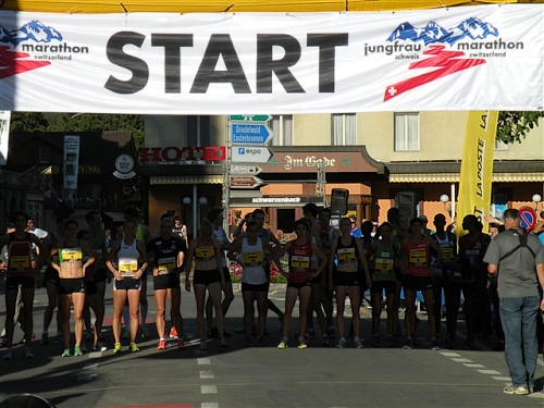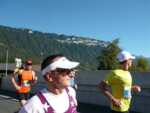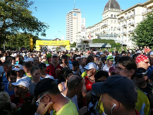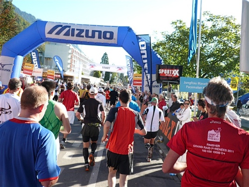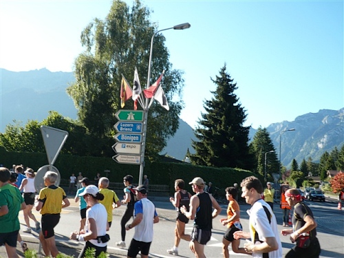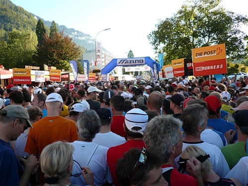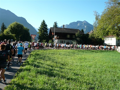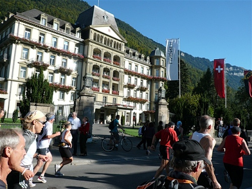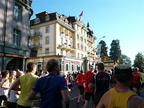Um Punkt 9:00 Uhr werden wir bei allerbestem Wetter, das sich den ganzen Tag halten wird, nach dem Abspielen der Schweizer Hymne von Viktor Röthlin am Hotel Victoria-Jungfrau mit Böllerschüssen zunächst auf eine 3 km-Schlaufe durch Interlaken geschickt. Diese Bedingungen hätte ich dem Daniel letzte Woche beim UTMB gewünscht, aber das Wetter kann man halt leider immer noch nicht vorbestellen. Wir haben heute einfach Schwein und davon jede Menge.