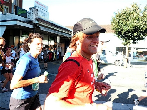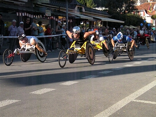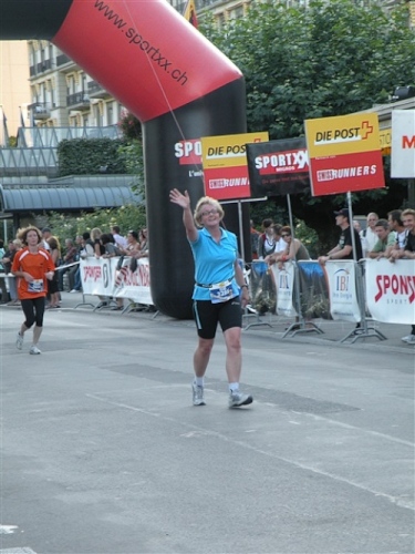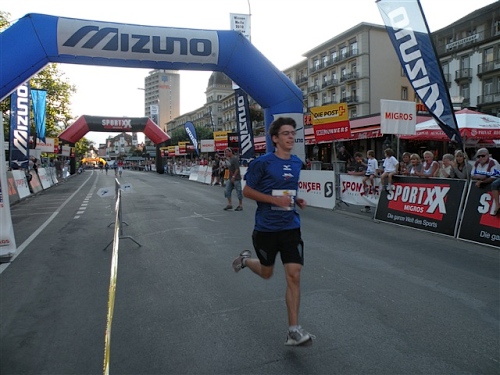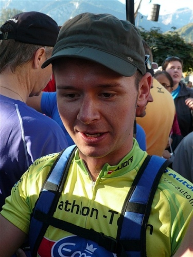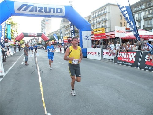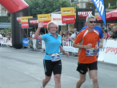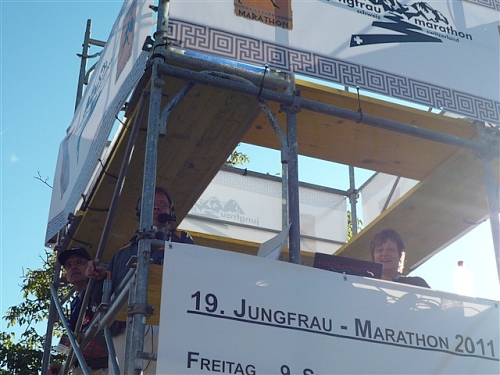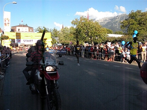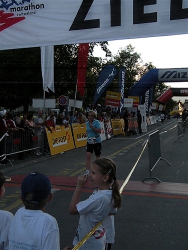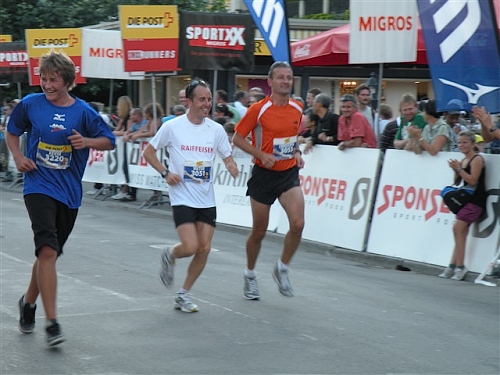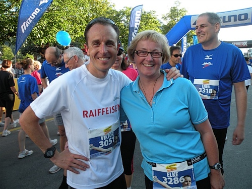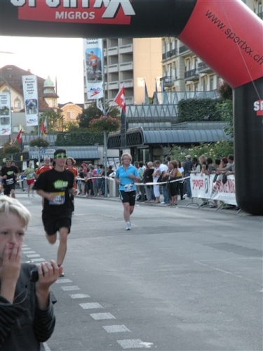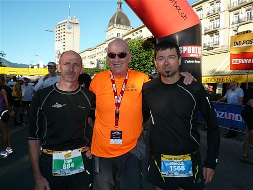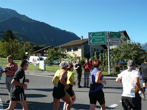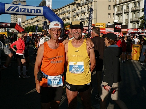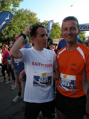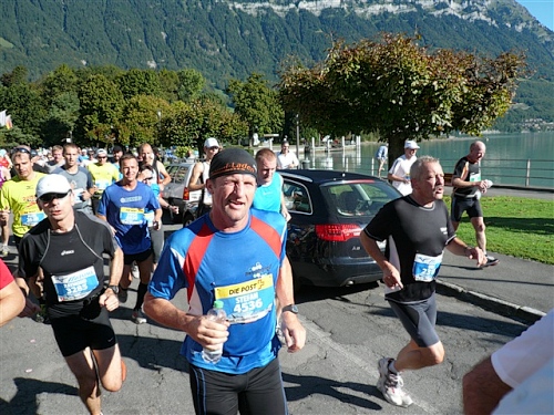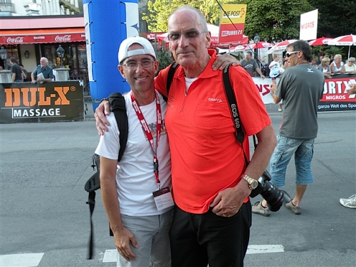 Abends trifft nebst seiner Frau Anita mein Freund Josef ein, der mich begleiten wird. Etliche lange Läufe haben wir zusammen absolviert und wir planen, soweit es geht und Sinn macht, zusammen zu laufen. Beim Minimarathon über 4,2195 km dreimal um die Höhematte kommt es zum Showdown. Zwischen dem Blitz aus Waldbreitbach, meiner mir gesetzlich angetrauten Gattin, und einem unbekannten Schweizer Nachwuchsläufer, Viktor irgendwas. Als Vertreter hochkarätigster deutscher Presseorgane komme ich ganz dicht an ihn heran und es gibt ein schönes Foto der beiden Duellanten. Ein netter Kerl, der Viktor, und die Gattin schmilzt dahin. Gespannt wartet sie schon auf den New York City-Marathon Anfang November, um ihn am Fernseher wenigstens moralisch zu unterstützen.
